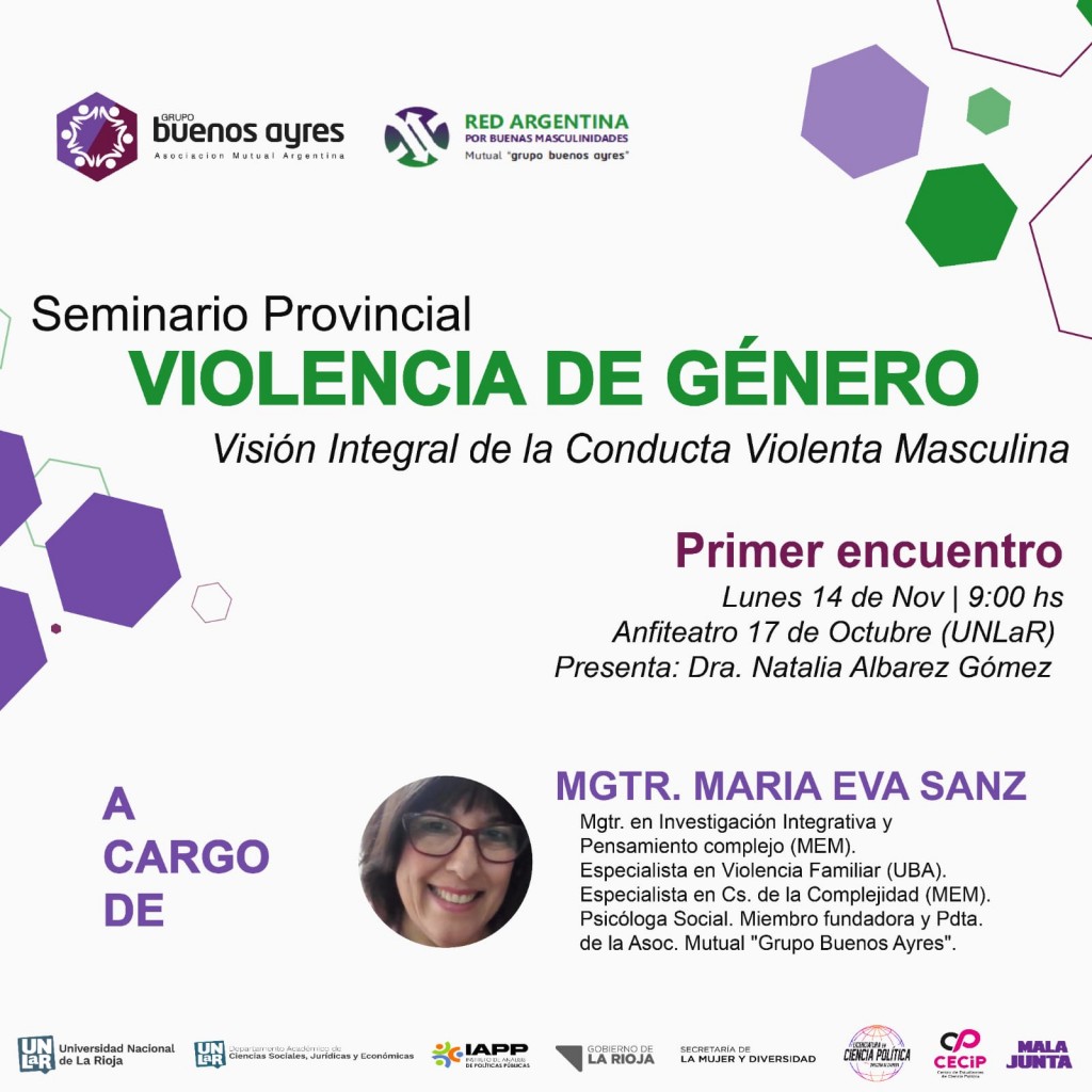 En el marco del Día Internacional de la Eliminación de la Violencia contra la Mujer que se conmemora el 25 de noviembre, se convoca a instituciones y organismos estatales, educativos, consejos profesionales, y organizaciones de la sociedad civil de toda la provincia a formar parte del Seminario dictado por la Mgter. María Eva Sanz, presidenta de la Asociación Mutual "GRUPO BUENOS AYRES", coordinadora de la Red Argentina por Buenas Masculinidades.