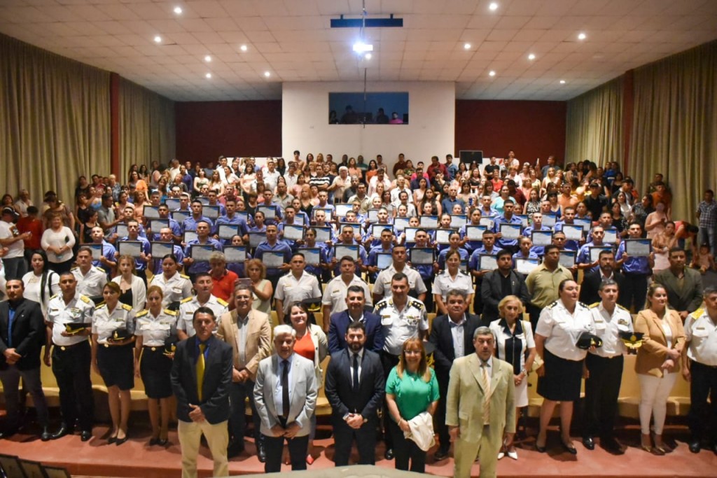 La ceremonia se desarrolló en el anfiteatro Luis Angel Oviedo de la ciudad de Chepes y contó con la presencia de la secretaria de Gestión Educativa, Zulma Rodríguez, el secretario de Seguridad, Pedro Fuentes, el Jefe de Policías de l Provincia, Roque Jaimes, el intendente del departamento Rosario Vera Peñaloza, Daniel Gallardo, el rector del Instituto Superior de Formación Integral en Seguridad Pública, Gustavo Artaza, diputados, concejales departamentales y demás autoridades.