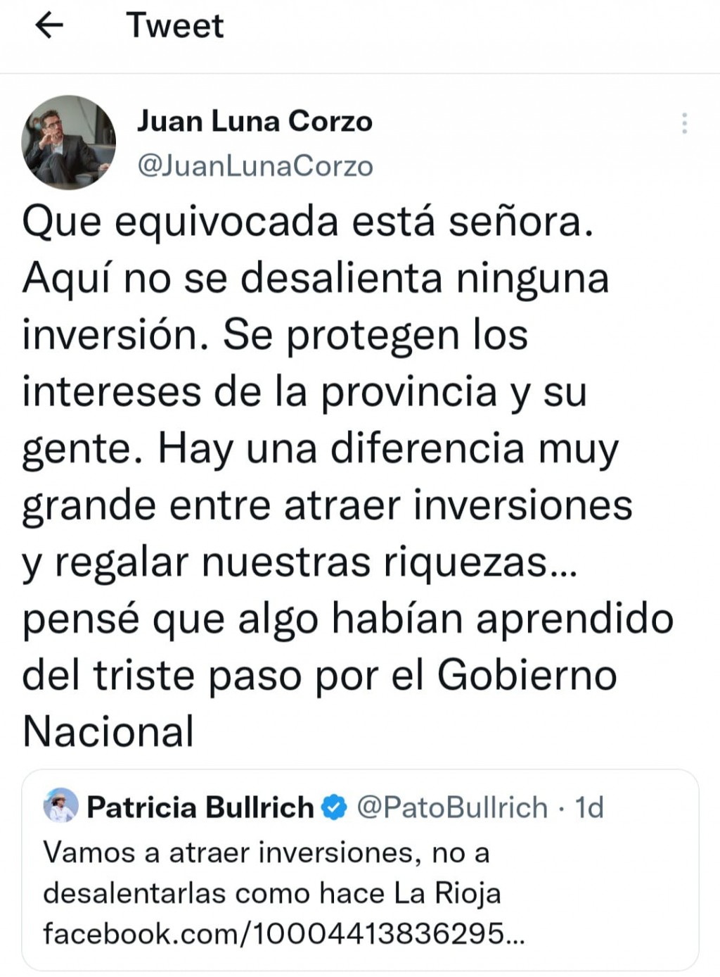 " Que equivocada está señora. Aquí no se desalienta ninguna inversión. Se protegen los intereses de la provincia y su gente. Hay una diferencia muy grande entre atraer inversiones y regalar nuestras riquezas" dijo Juan Luna en su cuenta de Twitter.