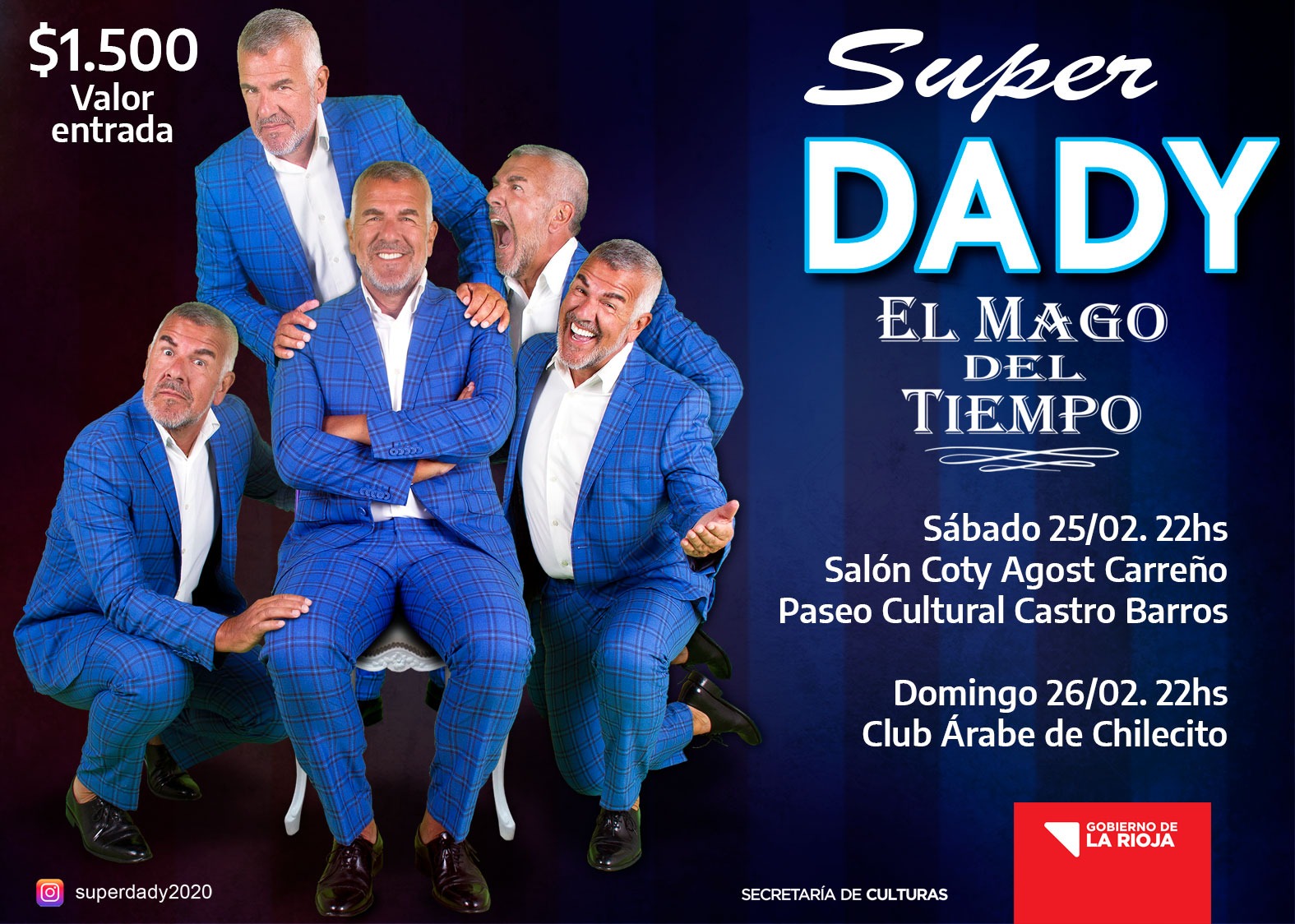 El reconocido cómico llega a La Rioja para presentar su nuevo espectáculo “Super Dady, el mago del tiempo”, el sábado 25 a las 22 horas en el Salón Coty Agost Carreño del Paseo Cultural; y el domingo 26 a la misma hora en el Club Árabe de Chilecito.
