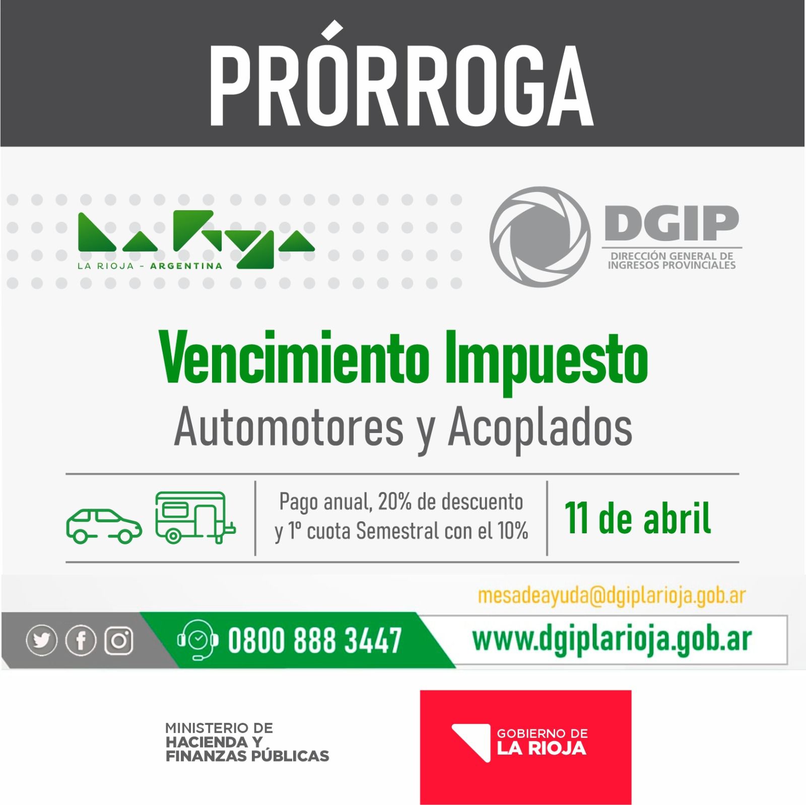 El Ministerio de Hacienda y Finanzas Públicas, a través de la Dirección General de Ingresos Provinciales (DGIP), comunica que decidió prorrogar hasta el 11 de Abril, el vencimiento del Impuesto a los Automotores y Acoplados del período 2023. Este beneficio estipula, descuentos de un 20 % en la modalidad de pago único anual y un 10 % en la 1ª cuota semestral.