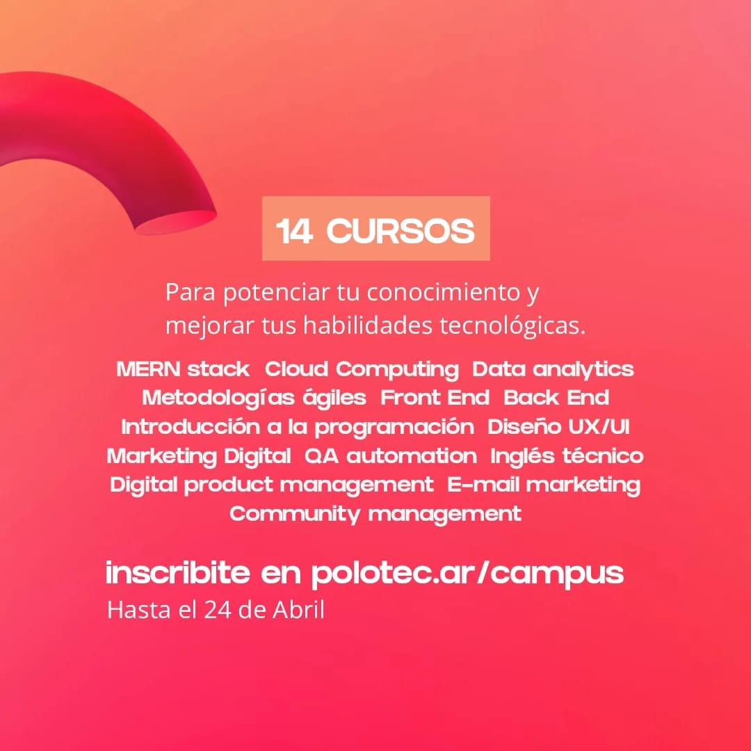 El Polo Tecnológico de La Rioja, dependiente de la Secretaría de Ciencia y Tecnología del Ministerio de Trabajo, Empleo e Industria, presentó su oferta de capacitación para el 2023 que incluye 14 cursos gratuitos para potenciar y mejorar las habilidades tecnológicas, y para los que no se requiere contar con conocimientos previos. Las capacitaciones refieren a M.E.R.N. stack, Cloud Computing, Metodologías ágiles, Data analytics, Marketing Digital, Diseño UX/UI, Introducción a la programación, Front End, Back End, QA automation, Community management, Digital product management, Inglés técnico y a E-mail marketing. Las inscripciones cierran el 24 de abril.