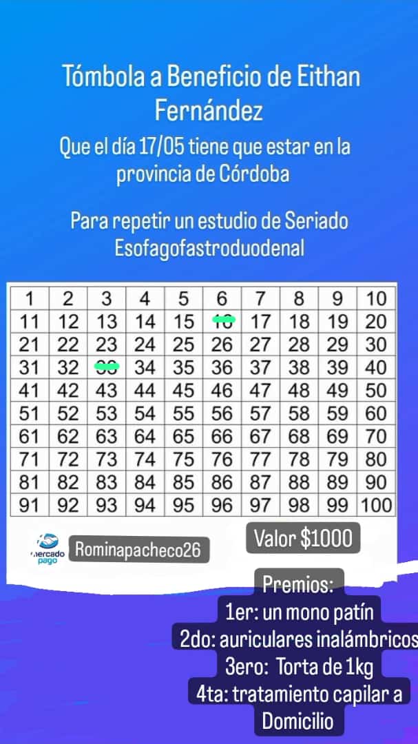 Podés hacer tu colaboración transfiriendo a Rominapacheco26 , el valor de la Tómbola es de mil pesos y se sortean tres premios.
