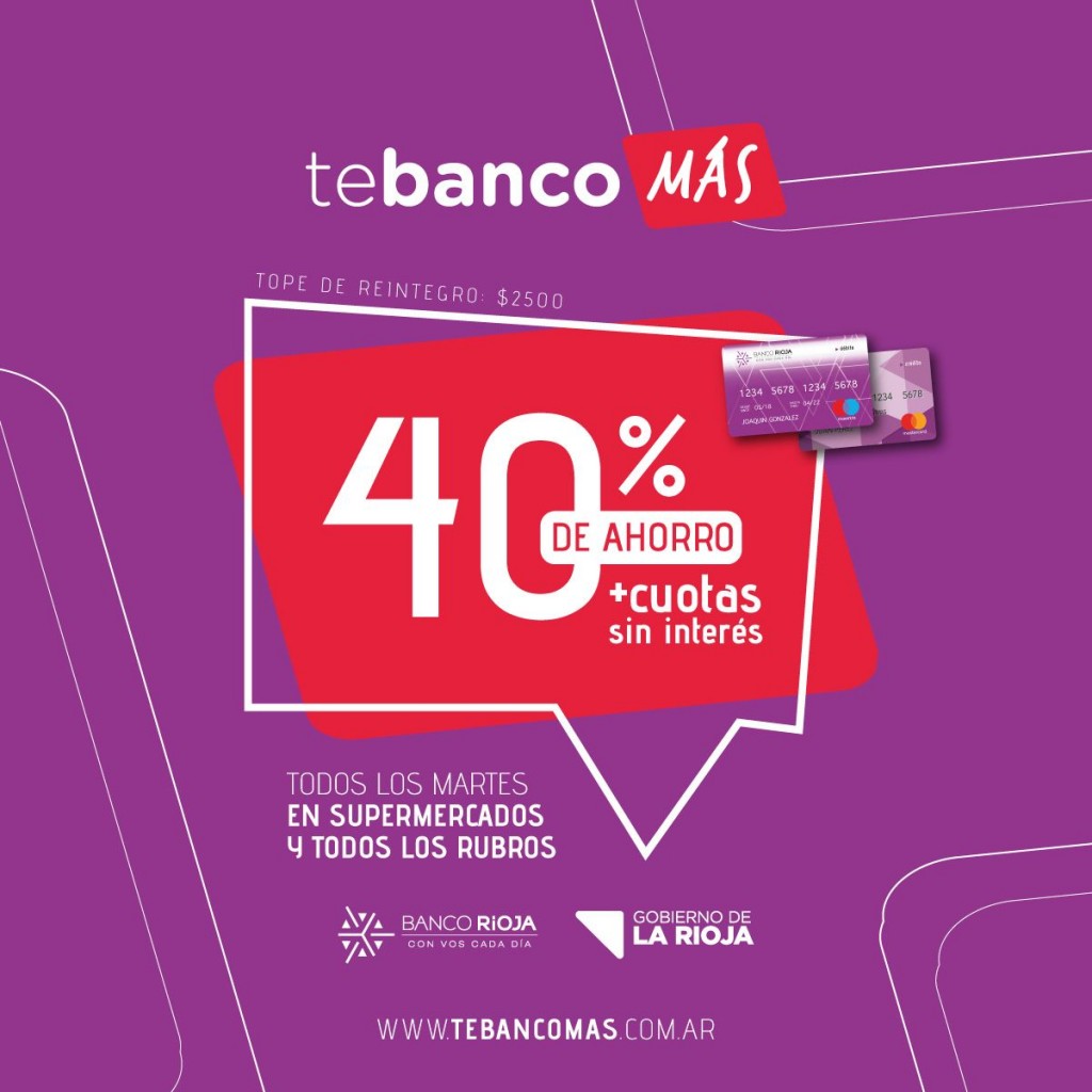 Te Banco Más, la nueva promoción bancaria que impulsa el Gobierno provincial a través de Banco Rioja, permite acceder a un 40% de descuento todos los martes en más de 160 comercios adheridos de toda la Provincia.