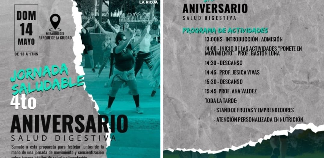 Enmarcado en el 4to aniversario de creacion del Departamento de Salud Digestiva del Ministerio de Salud Publica de La Rioja,se desarrollara este domingo 14 desde las 13 hs una jornada de movimiento y concientizacion sobre los buenos hábitos.
