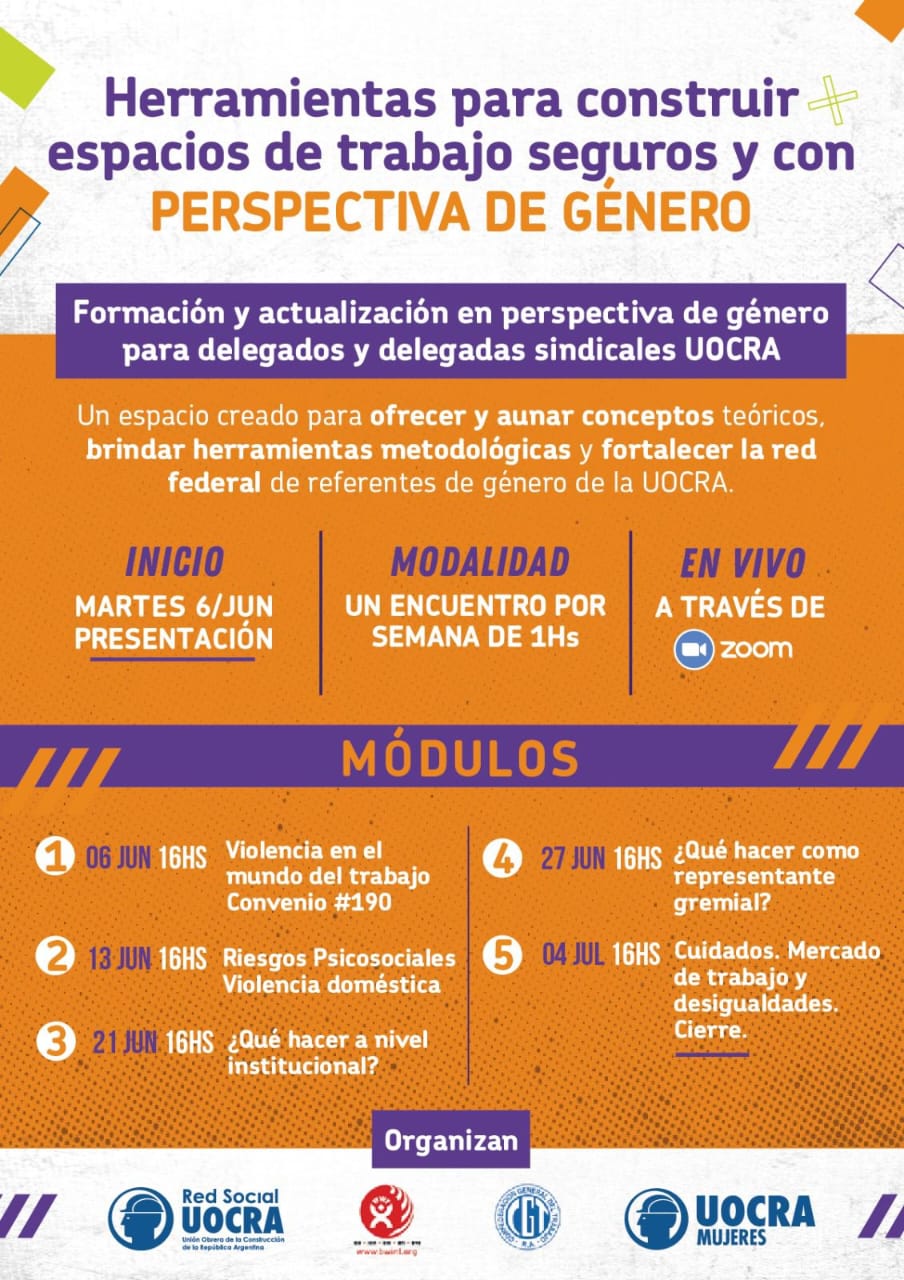 Hoy, por ejemplo, se llevó a cabo un taller virtual sobre “Nociones para la construcción de las Estructuras y la Seguridad Laboral”, y el martes 6 de junio iniciará un curso sobre “Herramientas para construir espacios de trabajo seguros y con perspectiva de género”, para delegados y delegadas sindicales.