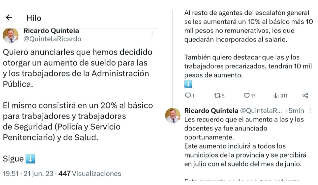 El incremento es de un 20% al básico para personal de Seguridad (Policía y Servicio Penitenciario) y de Salud. A través de sus redes sociales el gobernador Ricardo Quintela anunció que el “Personal del escalafón general se les aumentará un 10% al básico más 10 mil pesos no remunerativos, los que quedarán incorporados al salario”.