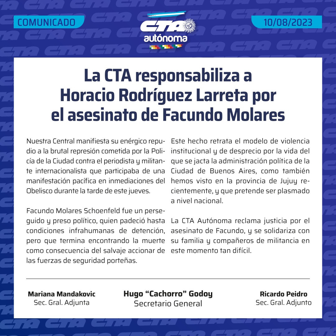 El fallecido fue identificado como Facundo Molares, de 47 años. En el lugar agrupaciones políticas de izquierda y organizaciones sociales realizaban una marcha convocada "contra la farsa electoral y la democracia del pueblo".