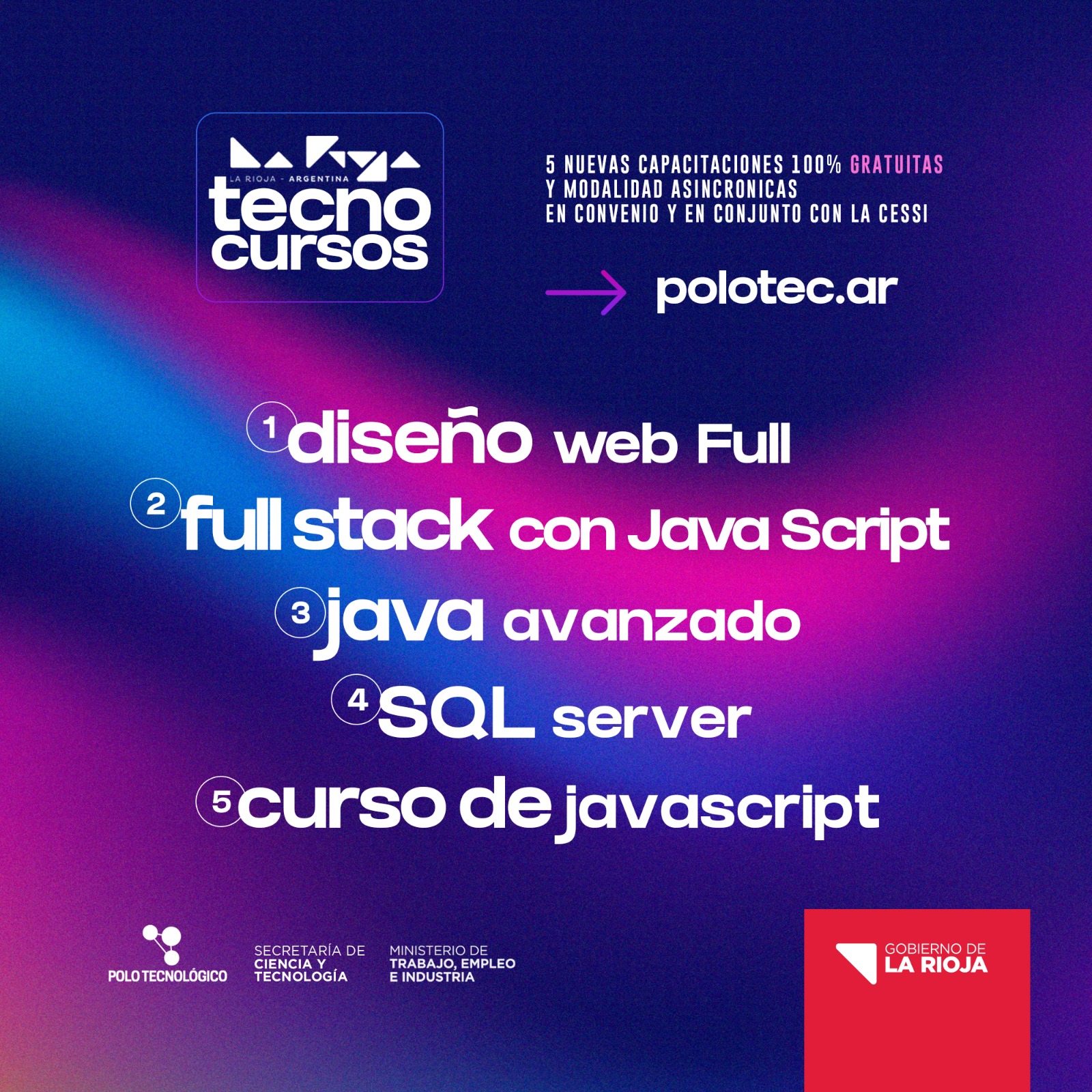 La Secretaría de Ciencia y Tecnología dependiente del Ministerio de Trabajo, Empleo e Industria en un trabajo conjunto con La Cámara de la Industria Argentina del Software (CESSI) brindarán a profesionales y entusiastas de la tecnología la oportunidad de potenciar sus habilidades y conocimientos con 5 capacitaciones gratuitas de programación.