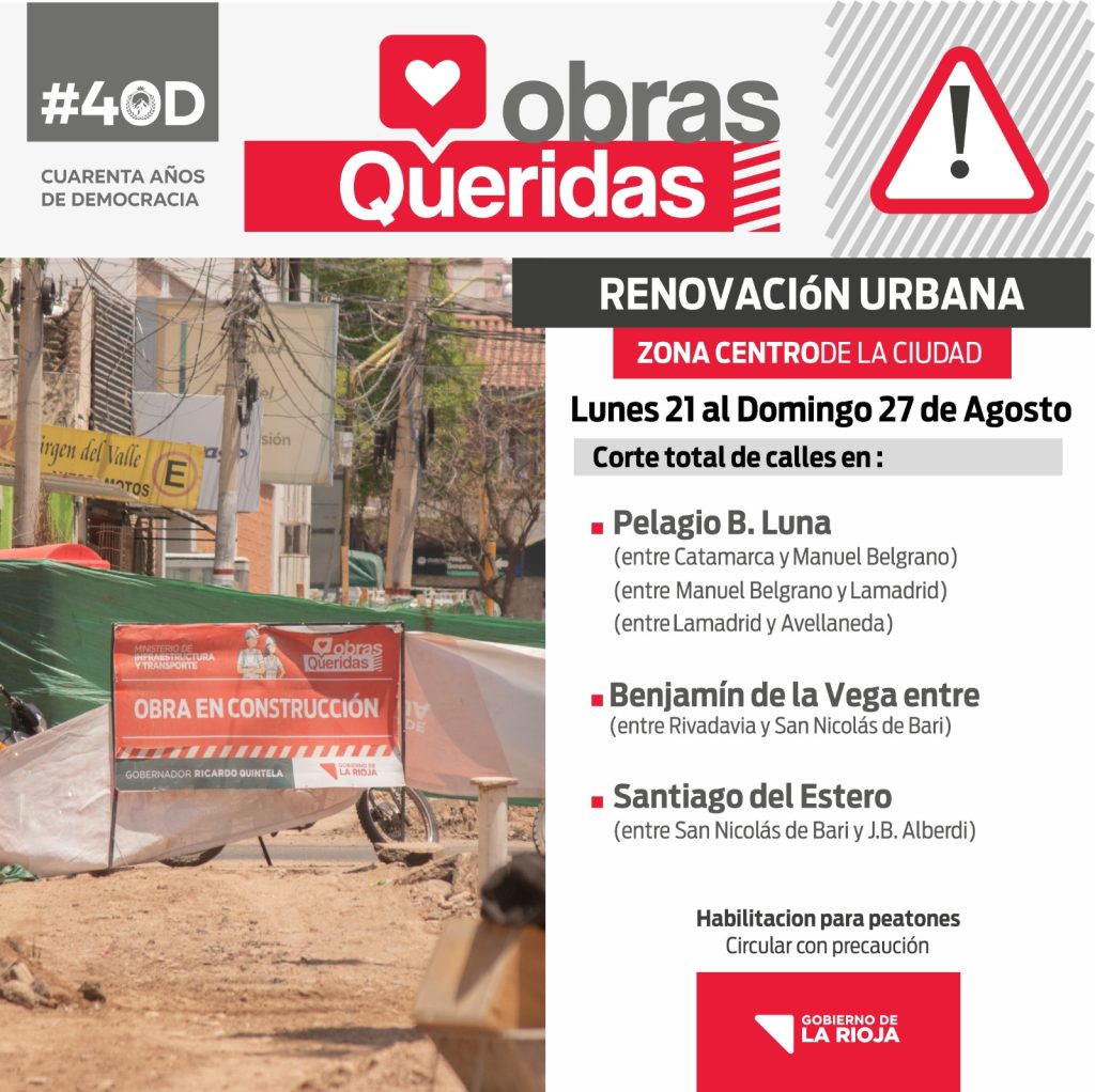 El Gobierno de La Rioja comunica el cronograma de cortes de calles por las obras de Renovación Urbana y Desagües Pluviales del área central de la ciudad Capital, previstos para la semana del 21 al 26 de agosto, con el objetivo de evitar el embotellamiento vehicular en la zona.