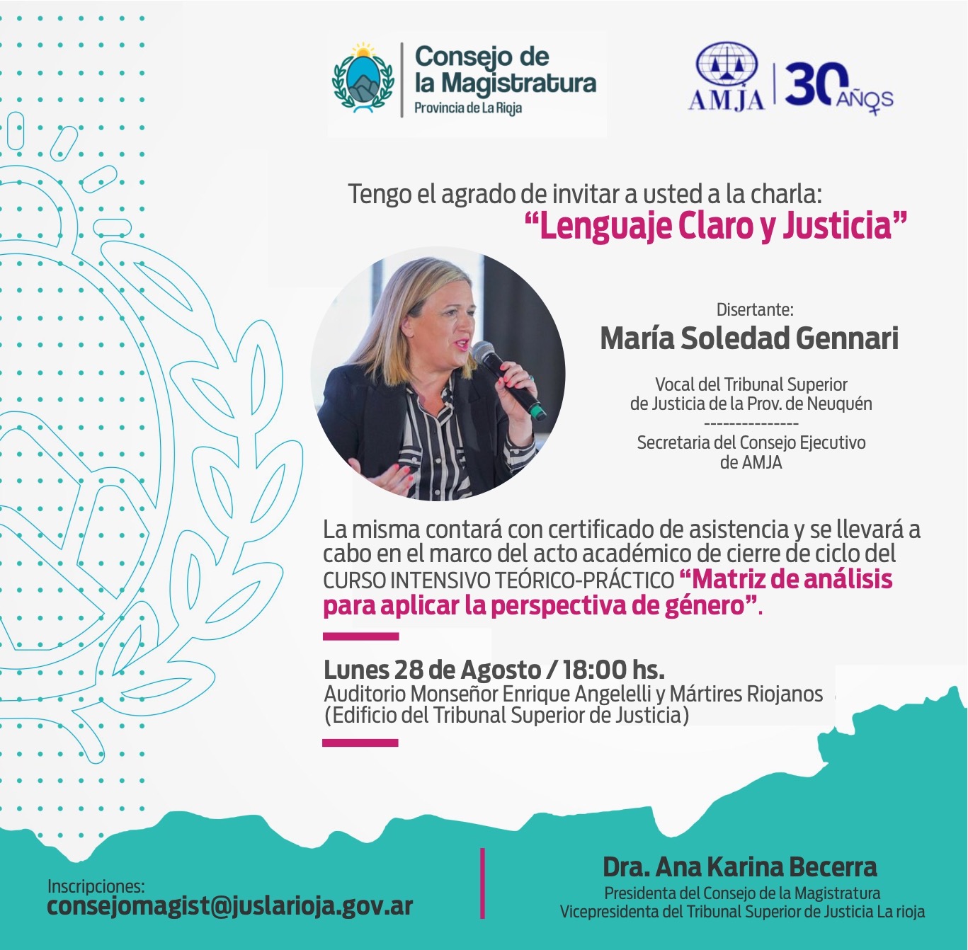 Con el auspicio del Consejo de la Magistratura de la Provincia de La Rioja, el próximo Lunes 28 de Agosto a las 18.00 hs, se llevará a cabo en el Auditorio Monseñor Enrique Angelelli y Mártires Riojanos, del Tribunal Superior de Justicia, la charla: "Lenguaje Claro y Justicia", a cargo de la Dra. María Soledad Gennari (Vocal del Tribunal Superior de Justicia de Neuquén).