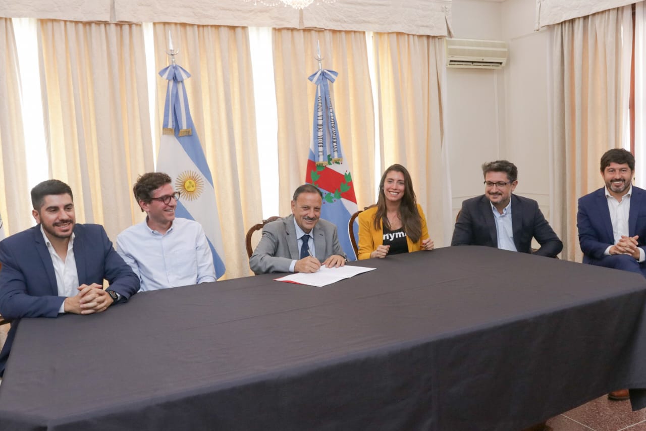 La firma de convenio de cooperación mutua, se rubricó este lunes en la Residencia Oficial, entre el gobernador Ricardo Quintela, junto al gerente general de Banco Rioja S.A.U, Raúl Cabral, y el gerente de Relaciones Gubernamentales y Políticas Públicas de RAPPI ARG S.A.S, Gabriel Bueno. También estuvieron presentes, la vicegobernadora Florencia López; el ministro de Trabajo Empleo e Industria, Federico Bazán; y el diputado nacional Ricardo Herrera.