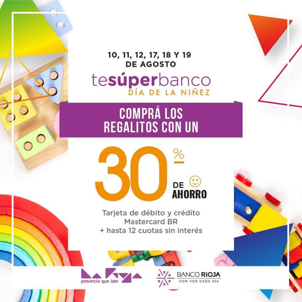 En el marco del mes de la infancia, desde Banco Rioja presentaron “Te super banco: Mes de la Niñez” que brinda descuentos en jugueterías, indumentaria y calzado, los días de la promoción son los miércoles, jueves y viernes 10, 11, 12, 17, 18 y 19 de agosto.