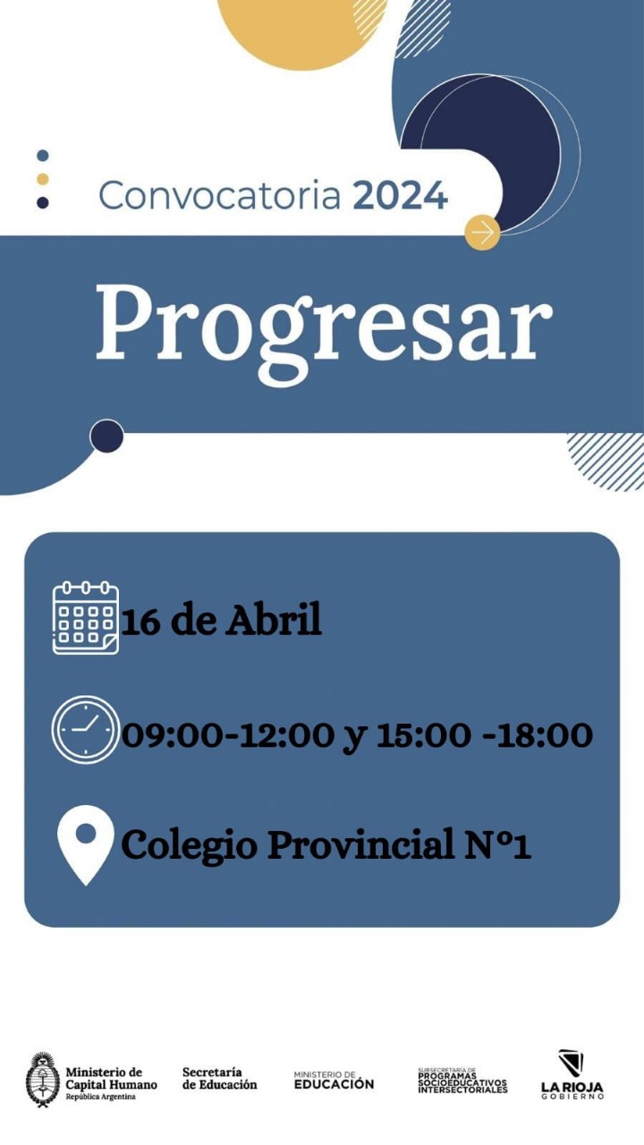 El martes 16 de abril, el Gobierno de La Rioja, a través del Ministerio de Educación, informa que continúa la inscripción para Progesar, de 15 a 18 hs. en el Colegio Provincial N°1. Estas líneas de becas tienen como objetivo acompañar a los jóvenes para finalizar la educación obligatoria, estudiar en el nivel superior o formarse profesionalmente.