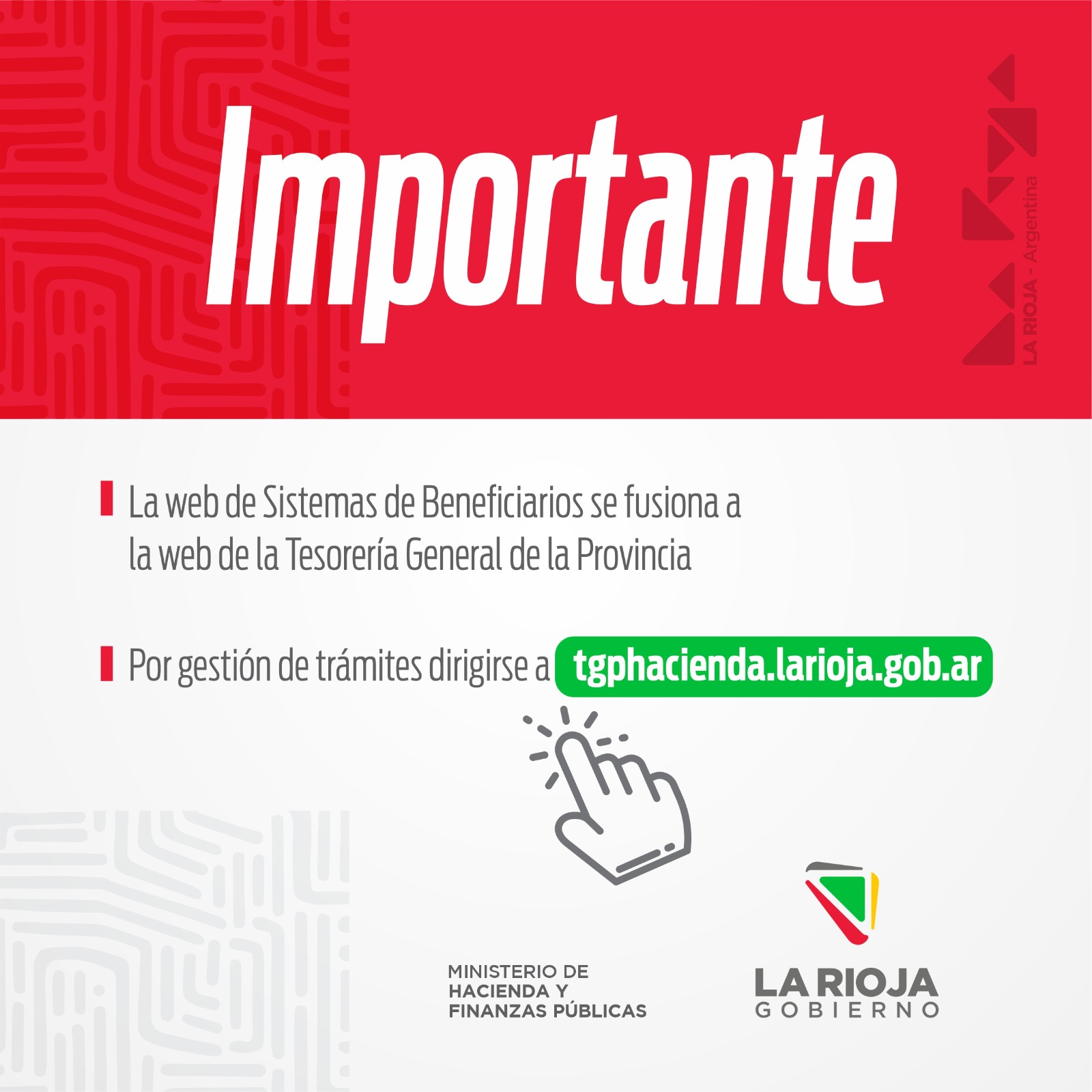 El Ministerio de Hacienda y Finanzas Públicas comunica que la anterior web del Sistema de Beneficiarios se dio de baja para fusionarse con la página de la Tesorería General de la Provincia tgphacienda.larioja.gob.ar.