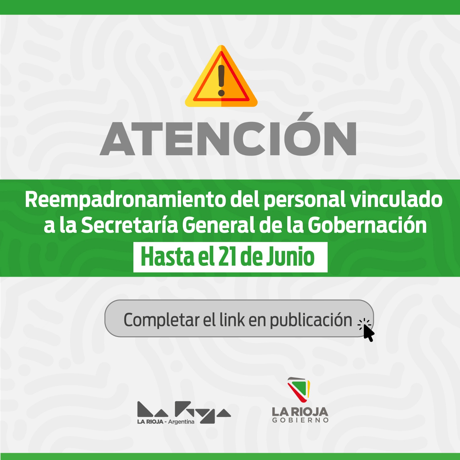 El Gobierno de La Rioja informa que con el objetivo de mantener actualizados los datos de todo el personal vinculado a la Secretaria General de la Gobernación, continúa abierto el proceso de reempadronamiento de contratos de locación de servicios, becas y programas laborales hasta el viernes 21 de junio.
