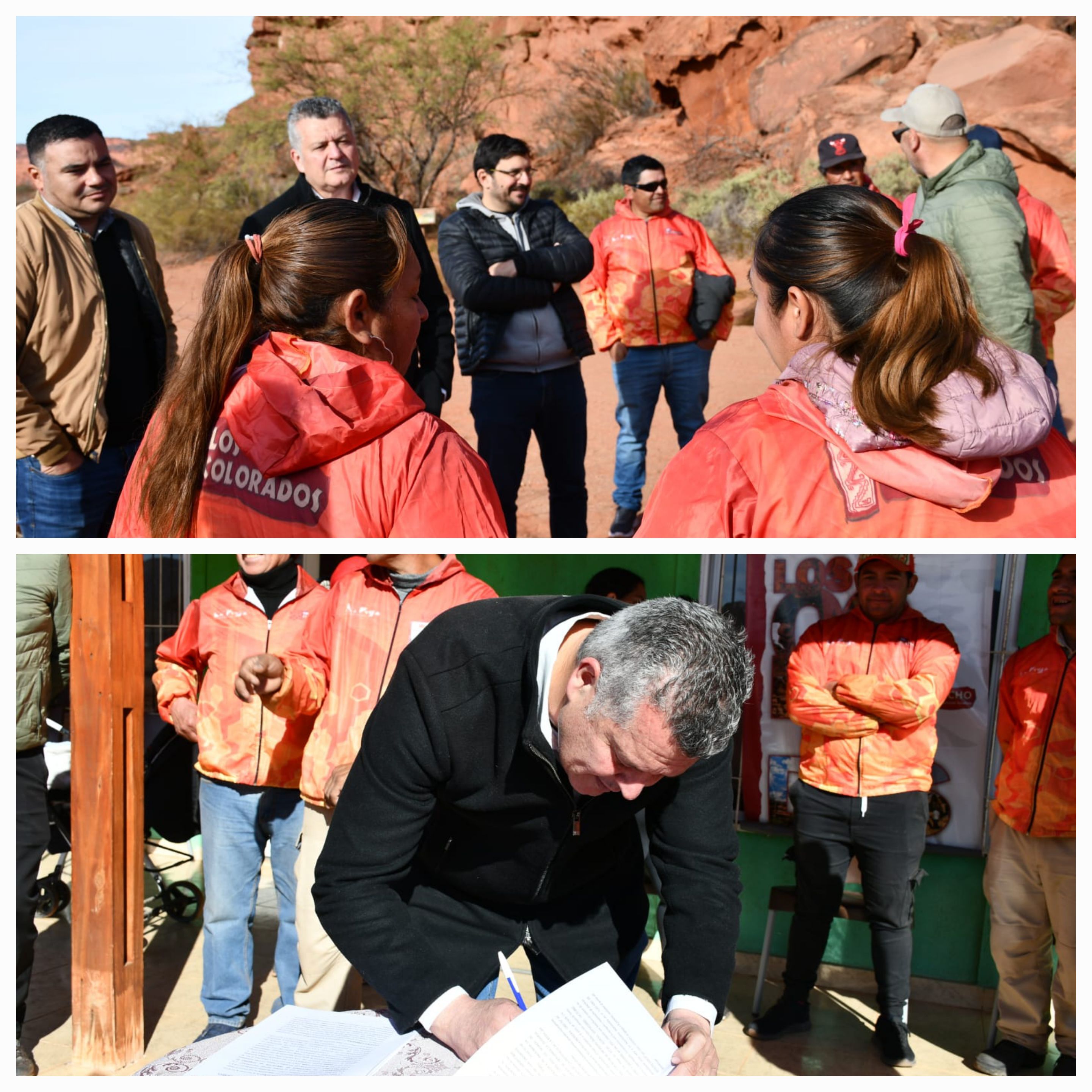 El ministro Gustavo Luna y el intendente del departamento Independencia, Claudio Akiki, visitaron el Parque Provincial Los Colorados para suscribir la extensión del convenio con los 18 integrantes de la cooperativa que opera el circuito turístico que tiene como principales atractivos el refugio del Chacho Peñaloza, los Farallones y el Puente Natural.