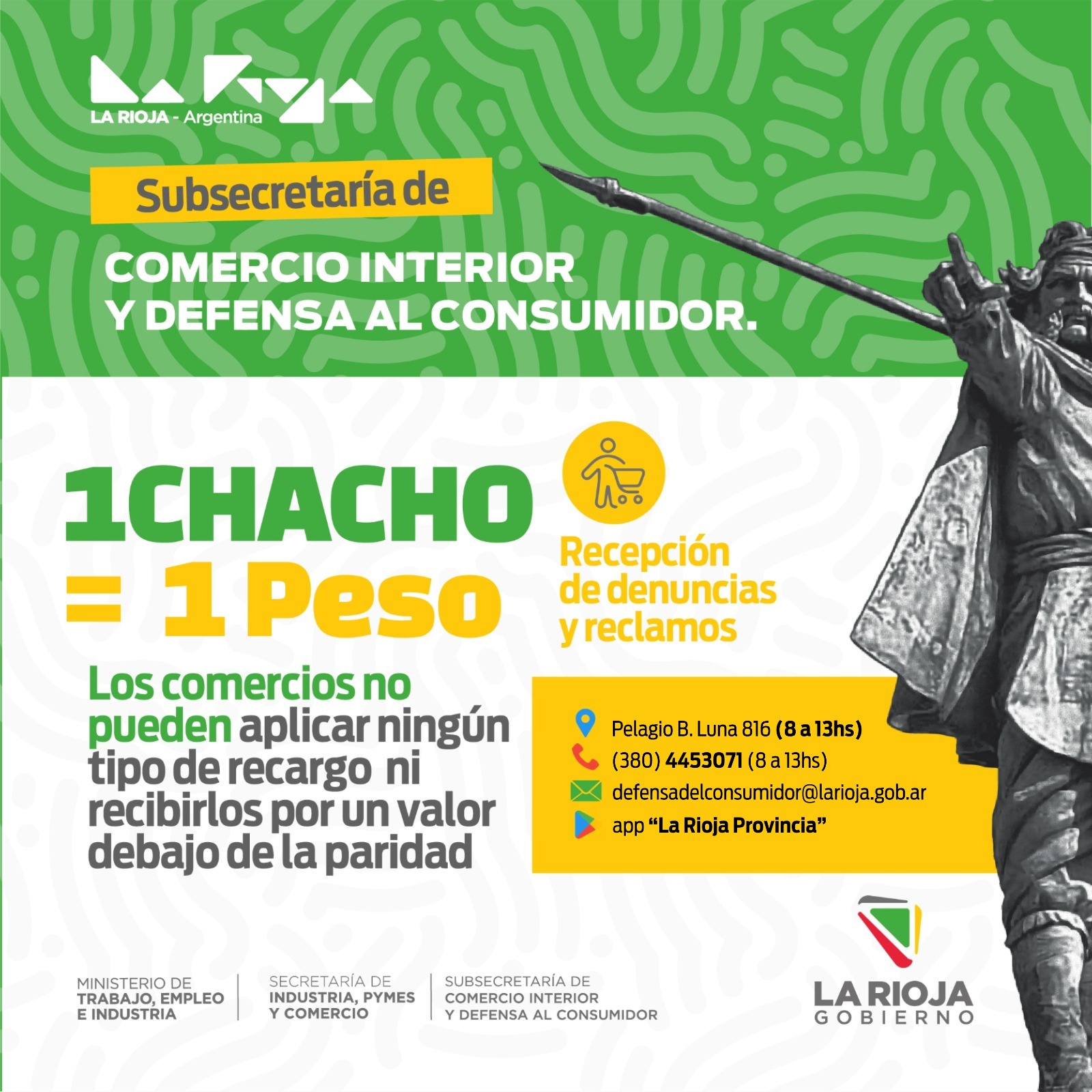 “Se puede denunciar cualquier situación que perjudique al consumidor, como el cobro con recargo o el cobro por debajo de la paridad”, estableció la funcionaria, por lo que es preciso recordar que un Chacho es igual a un peso.