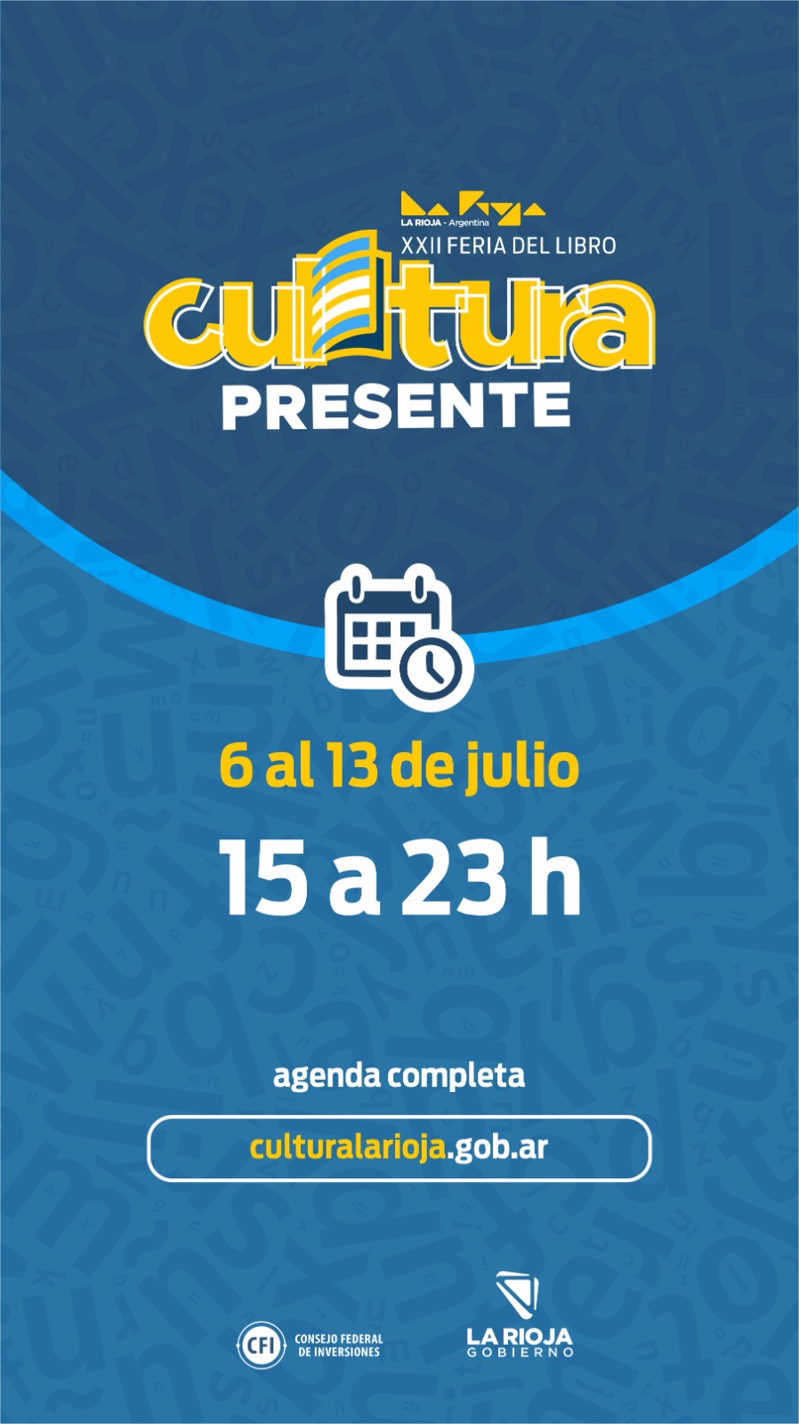 El programa de todas las actividades de esta XXII Feria de Libro “Cultura Presente” se puede consultar en el sitio web de la Secretaría de Culturas www.culturalarioja.gob.ar .