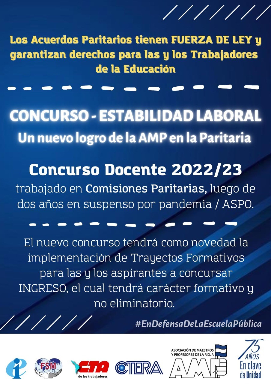 Este acuerdo formó parte de un trabajo sostenido en varias reuniones paritarias con participación activa de las bases con el objeto de concretar, en el presente año, el anhelado Concurso Docente que coronará con la Estabilidad Laboral de los/ las trabajadoras de la educación.