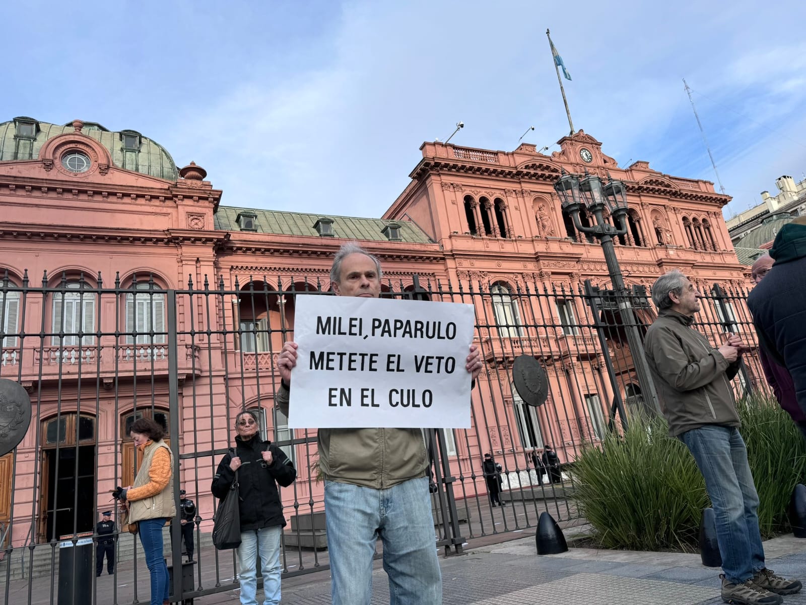Otro jubilado reclamó: "¿Quién puede vivir con $10.000 por día? nosotros pusimos durante 40 años el 20% de nuestro sueldo y es hora de que el Estado nos devuelva la plata que pusimos. No nos importa si es Milei, es Fulano o es Sultano, a nosotros nos vendieron una auto cero kilómetros y ahora nos quieren dar una bicicleta pinchada".