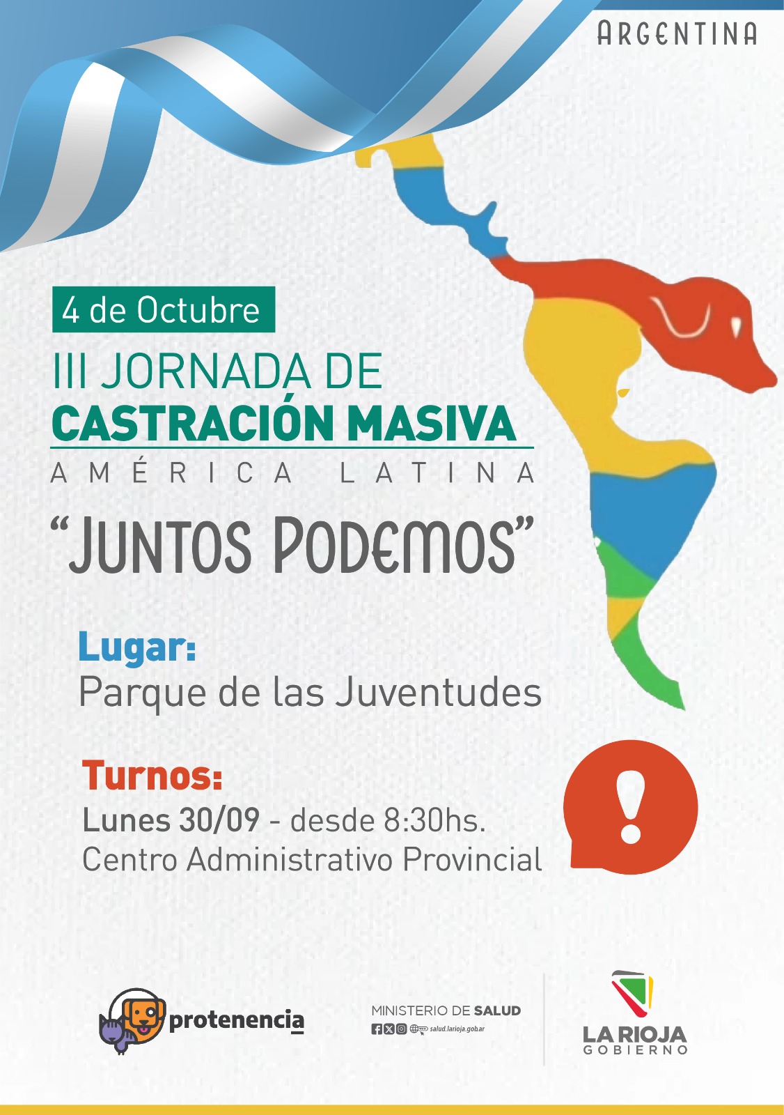 Invitados por el Programa Nacional de Tenencia Responsable y Sanidad de Perros y Gatos (PROTENENCIA), el Ministerio de Salud participará el próximo 4 de octubre en la jornada de castración, que se llevará a cabo en el Parque de las Juventudes a partir de las 8 hs. Las castraciones se realizarán con turnos programados, los cuales se otorgarán el lunes 30 de octubre a partir de las 8:30 en el Centro Administrativo Provincial.