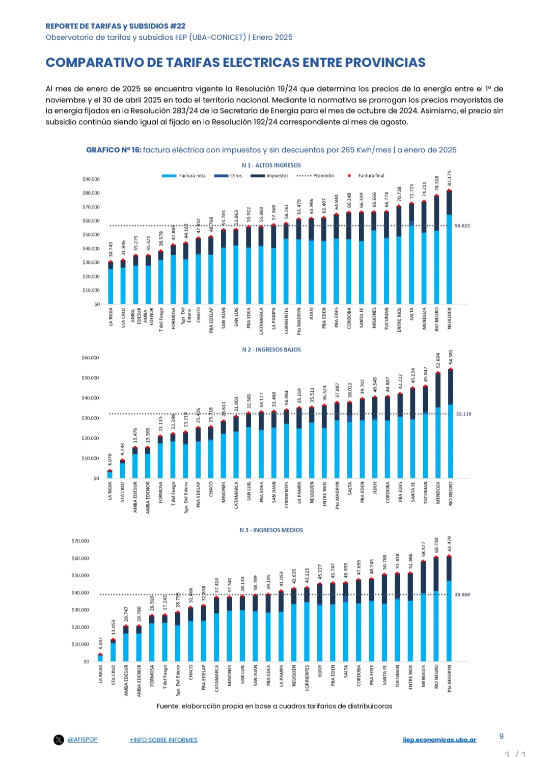 En el caso de los usuarios N1 (ingresos altos), el informe arrojó que en La Rioja se pagan boletas promedio de $30.743. Este monto incluye impuestos, es decir, es el monto final que recibe el usuario en su factura. La tarifa más alta se paga en Neuquén, con una cifra promedio de $82.175. Un punto a destacar es que para los usuarios N1, el valor de la factura promedio a nivel nacional es de $56.662. Es decir, La Rioja se encuentra muy por debajo de la media nacional.