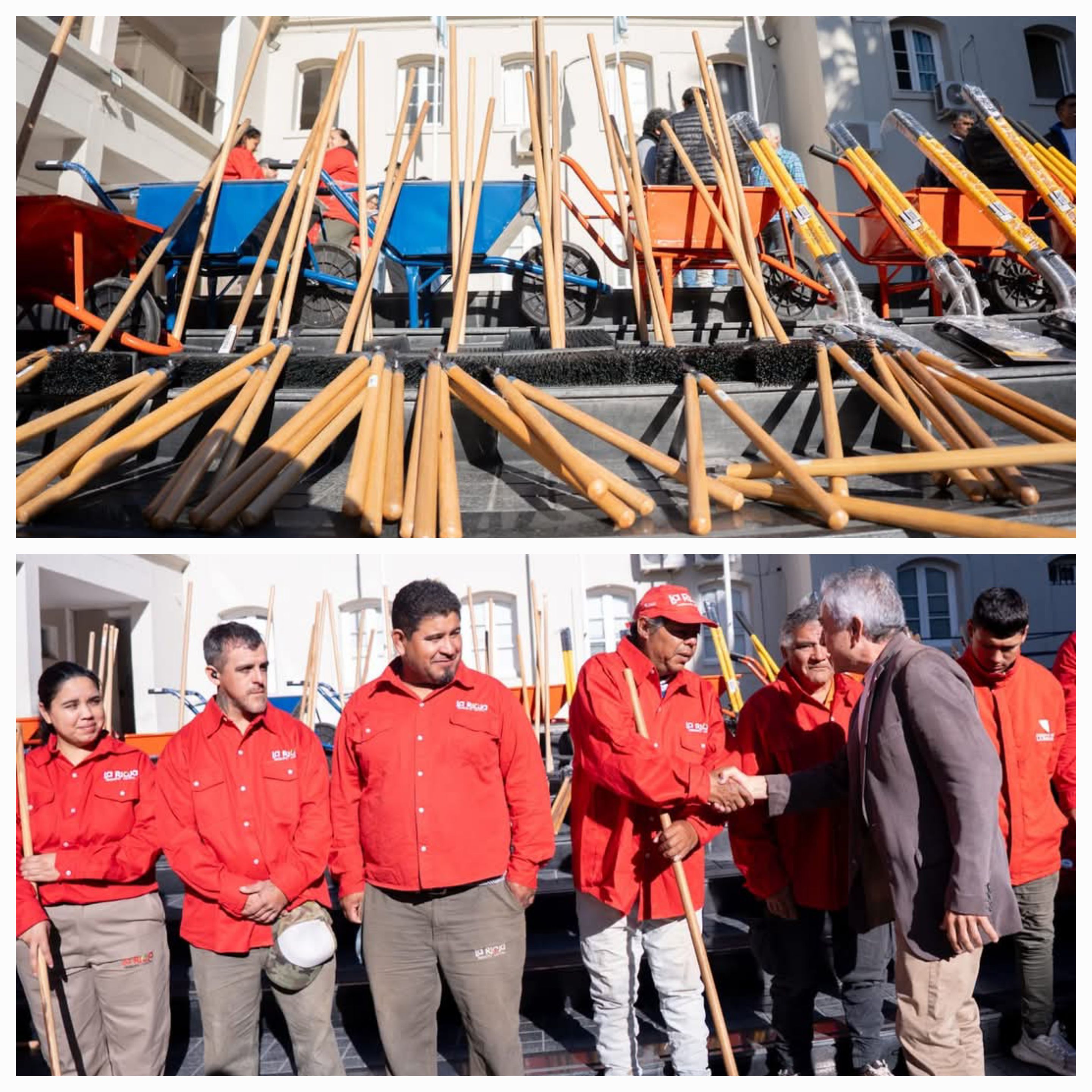 Dentro de los equipos entregados, se incluyen maquinaria liviana y herramientas de mano para tareas de limpieza: 60 cepillo barrendero, 60 rastrillos barre hojas, 43 palas anchas, 40 carretillas, 20 machetes y 20 podones de jardinería.