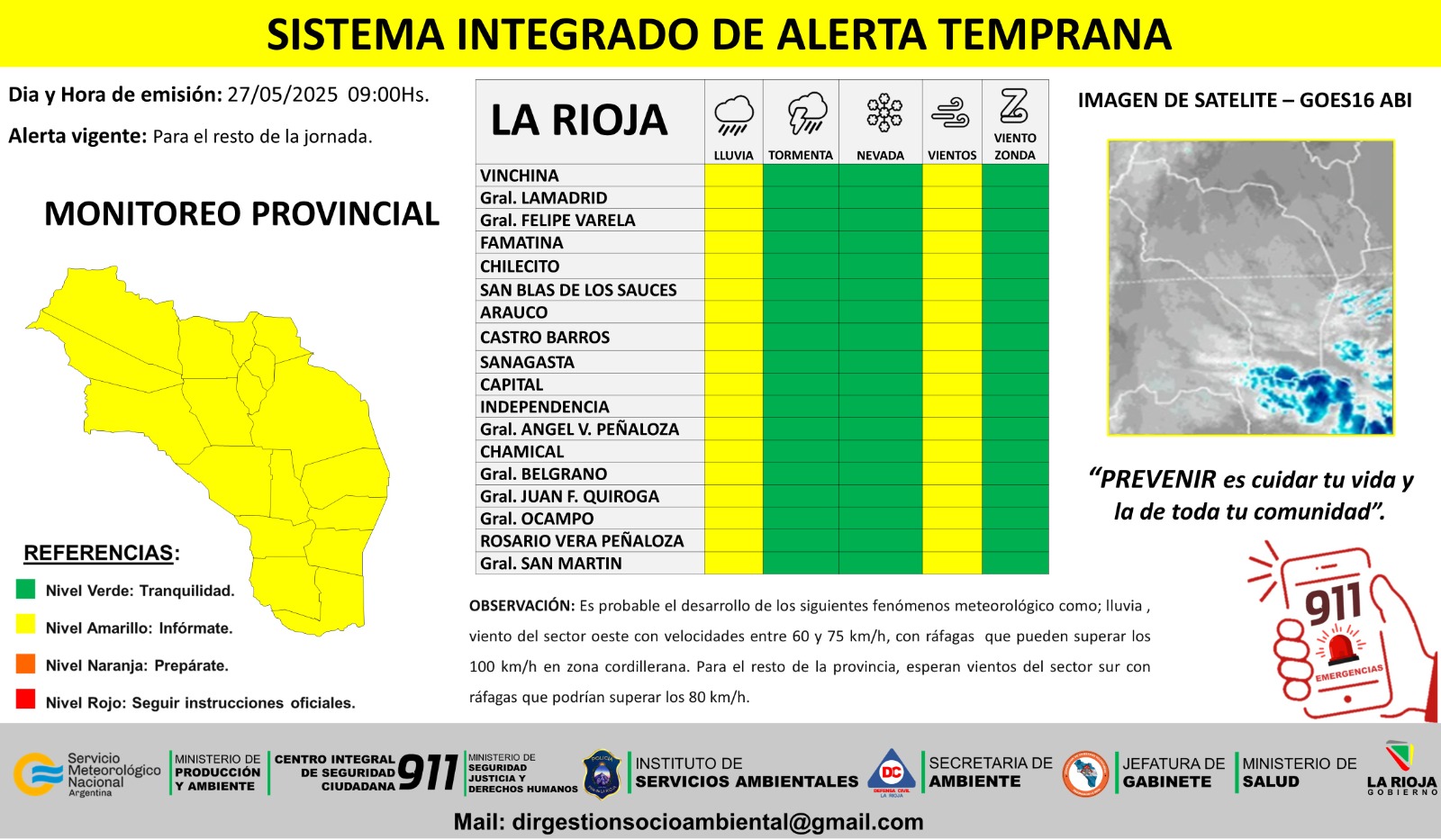 El alerta emitido a las 9.00 horas de este martes, sigue vigente e indica que, es probable el desarrollo de los siguientes fenómenos climáticos como lluvia, viento del sector Oeste con velocidades entre 60 y 70 km/h, con ráfagas que pueden superar los 100 km/h en la Zona Cordillerana. Para el resto de la Provincia se prevén vientos del sector Sur con ráfagas que podrían superar los 80 km/h.