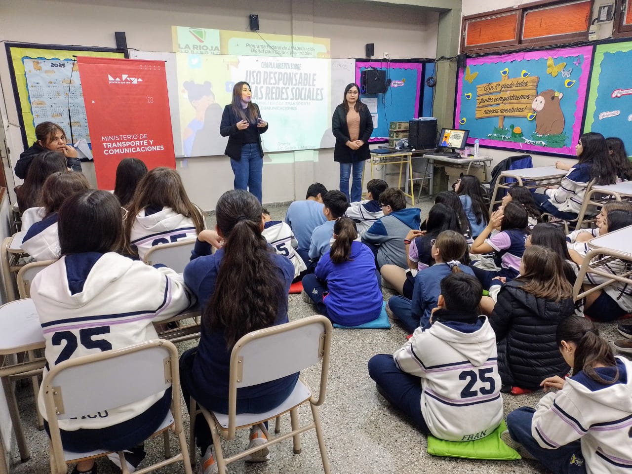En el marco de las políticas públicas impulsadas por el Gobierno de La Rioja, a través del Ministerio de Transporte y Comunicaciones, se llevó a cabo una charla educativa en la Escuela Privada Gabriela Mistral (Jornada Simple), destinada a estudiantes de 7º grado, docentes y autoridades escolares. La actividad se enmarca en el eje estratégico de conectividad, inclusión y alfabetización digital, con el objetivo de fomentar el uso responsable y consciente de las tecnologías digitales entre niños, niñas y adolescentes.