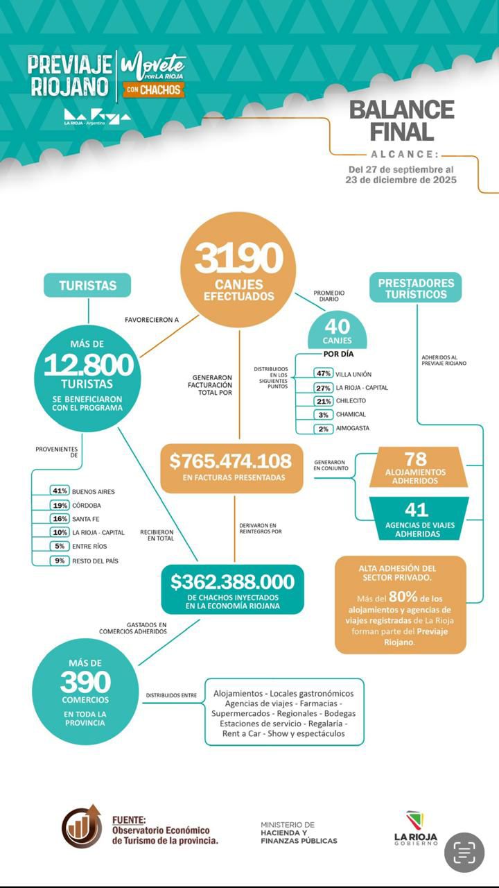 El Observatorio Económico del Turismo de La Rioja dio a conocer el balance final sobre el desempeño del programa, desarrollado entre el 27 de septiembre y el 23 de diciembre, período en el que se registró un importante movimiento turístico y comercial en la provincia. Durante este lapso, se presentaron facturas por $765.474.108, mientras que el volumen operado en Chachos alcanzó los $362.388.000, reflejando la confianza de prestadores y comercios en esta herramienta y su aporte a la dinámica económica del turismo. El programa registró un promedio de 40 canjes diarios, con la participación de 78 alojamientos, 41 agencias de viajes y más de 390 comercios adheridos, consolidando una articulación sostenida entre el sector público y privado que permitió fortalecer la experiencia turística y el consumo local. En cuanto a la demanda, se contabilizó la llegada de 12.800 turistas, con más de los 80 % provenientes de otras provincias. El principal origen fue Buenos Aires (41 %), seguido por Córdoba (19 %), Santa Fe (16 %), Entre Ríos (5 %) y el resto del país (9 %), mientras que el 10 % correspondió a visitantes locales. Las voces del sector privado Hugo Moreno, presidente de la Cámara de Turismo de Chilecito, destacó la implementación del programa Previaje Riojano, subrayando que “ha sido una herramienta clave que permitió mejorar la presencia de turistas en el departamento”. Además, expresó su deseo de que la iniciativa se repita en el futuro, especialmente durante la temporada baja, y agregó: “Toda acción suma en este contexto de crisis tan difícil que hoy nos toca enfrentar”. Por su parte, Sergio Páez, titular de la agencia de viajes y turismo Runacay, resaltó los beneficios para la economía regional, especialmente en el Valle del Bermejo. “El programa generó una gran tracción económica, promoviendo un circuito virtuoso que impactó rápidamente y positivamente en la economía local, especialmente en el oeste. Toda la economía regional se vio muy beneficiada”, destacó. Páez calificó la experiencia como “cien por ciento positiva” y expresó su esperanza de que se pueda contar pronto con una nueva edición del programa, dada la gran repercusión que tuvo en el turismo interno.