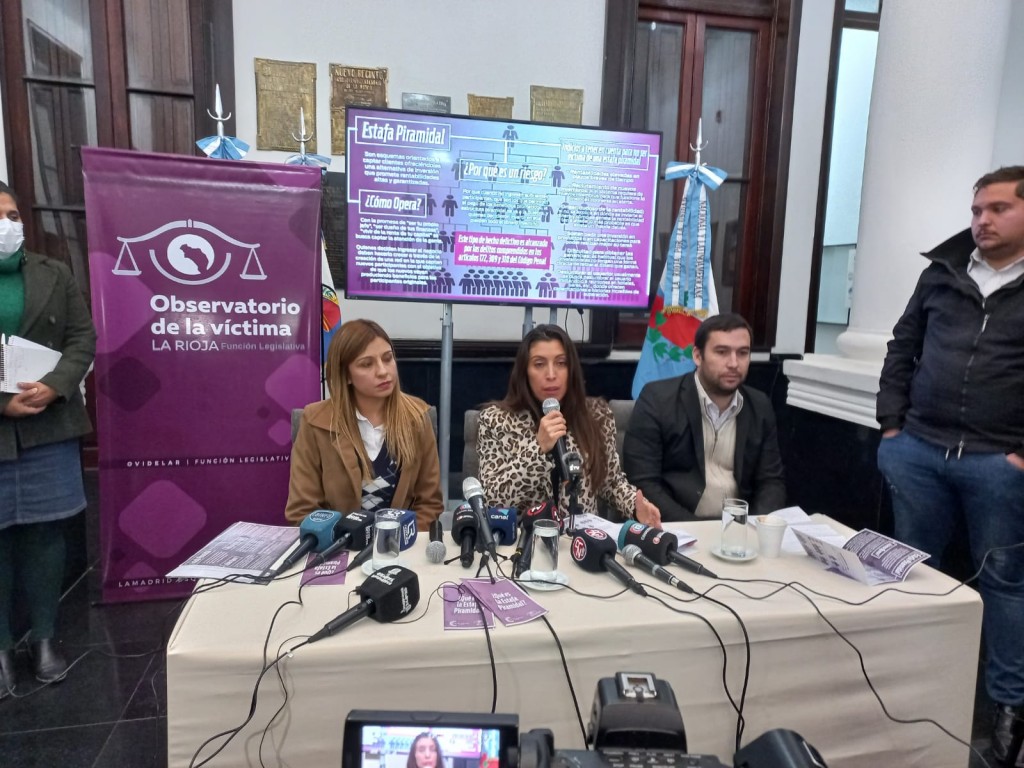 La abogada Jesica Pizarro agradecio el interes puesto de manifiesto por la Vicegobernadora y algunos Diputados para que mas personas no sean estafadas por este tipo de maniobras.La letrada dijo que si bien este delito aun no esta tipificado en el Codigo Penal porque es una figura nueva pero si existen recomendaciones para que tengan en cuenta a la hora de invertir.El folleto que se elaboro consiste en la manera en la que se manejan estos estafadores y las formas que existen para prevenir.Pizarro,integrante del equipo tecnico del Observatorio invito a todos aquellos que fueron victimas de estafas piramidal,a que lleguen hasta la institucion en donde se les brindara una orientacion sobre el caso que los afecte,ubicado en Bazan y Bustos y Lamadrid.