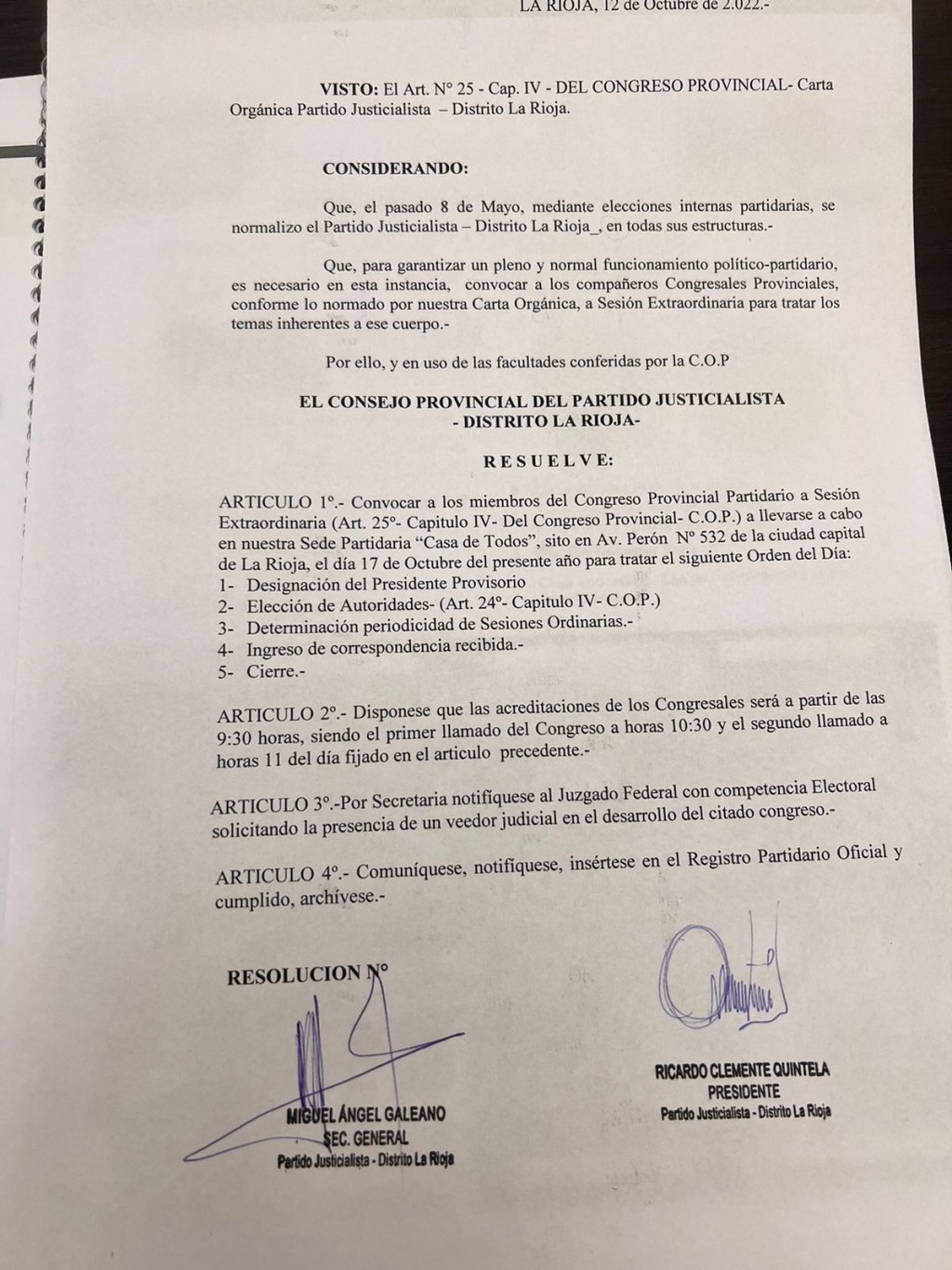 Con la firma del presidente del Consejo Provincial, Ricardo Quintela y el secretario General, Miguel Galeano, se emitió la convocatoria que estipula como orden del día la designación de un presidente provisorio, posterior elección de autoridades de acuerdo al artículo 25 Capítulo 4 de la Carta Orgánica partidaria, luego se tratará la determinación periodicidad de sesiones ordinarias e ingreso de correspondencia.
