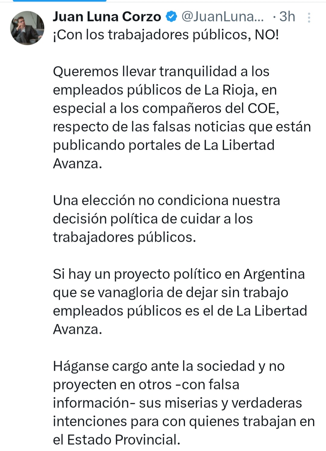 Estó posteó en sus redes sociales el Jefe de Gabinete de Ministros, Juan Luna Corzo, desmintiendo una noticia falsa difundida por el sector libertario.