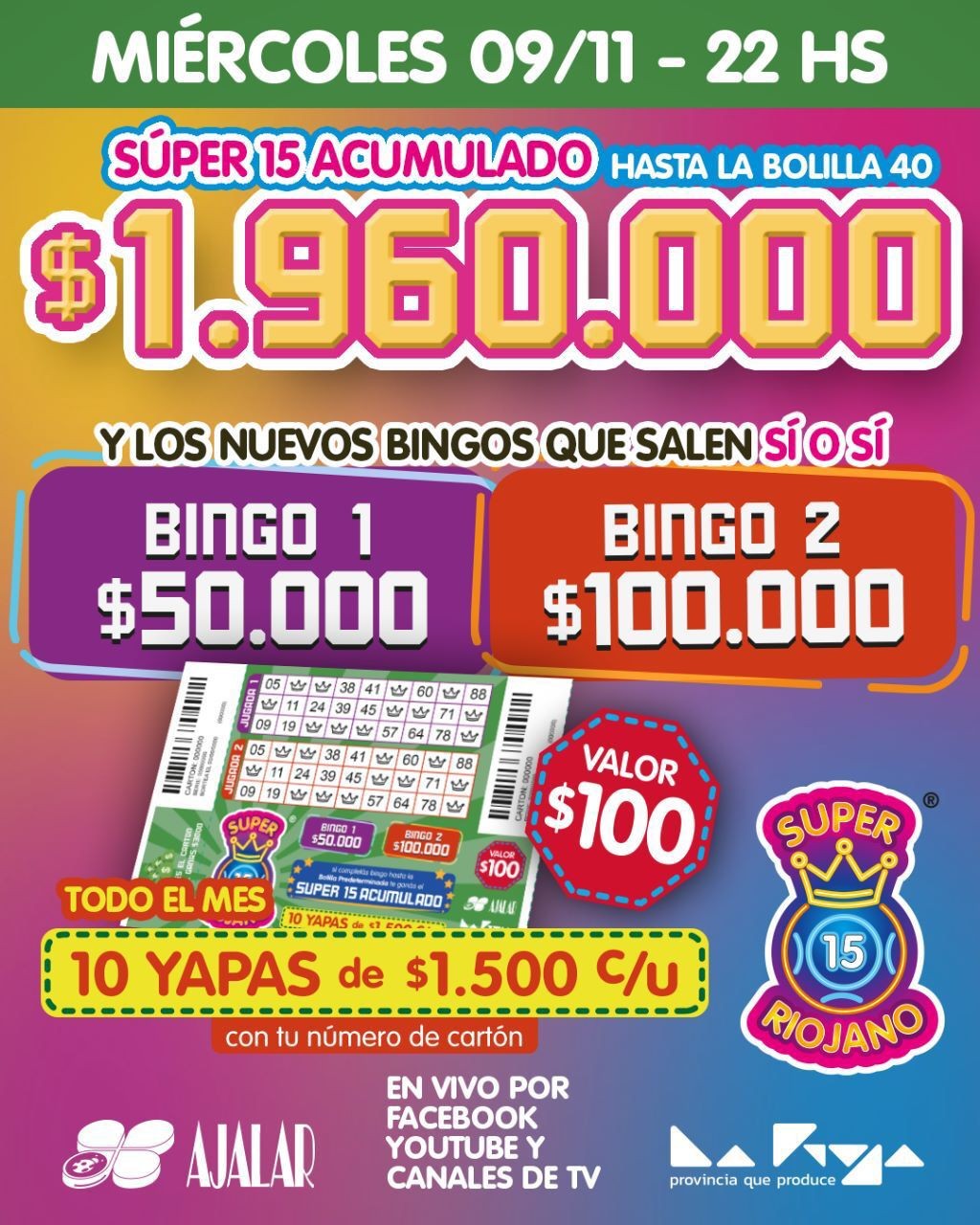El tradicional sorteo Super 15 Riojano que se realiza hoy a partir de las 21hs y tiene un pozo acumulado de 1.960.000 pesos, como así también se jugarán los bingos hasta la bolilla 40. Además, habrá 10 yapas de 1.500 pesos cada una, 5 para el interior y 5 para Capital. Cabe recordar el valor del cartón es de 100 pesos y se adquiere en agencias y vendedores oficiales.