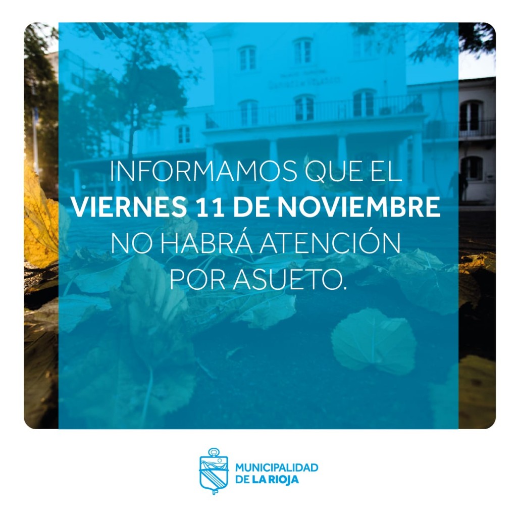 Se comunica que debido al asueto por el Día del Empleado Municipal, que se celebró el día 8 de noviembre, no habrá atención en el Palacio Municipal, ni en las instituciones deportivas, culturales, sedes administrativas, rentas y centros de emisión de licencias de conducir.