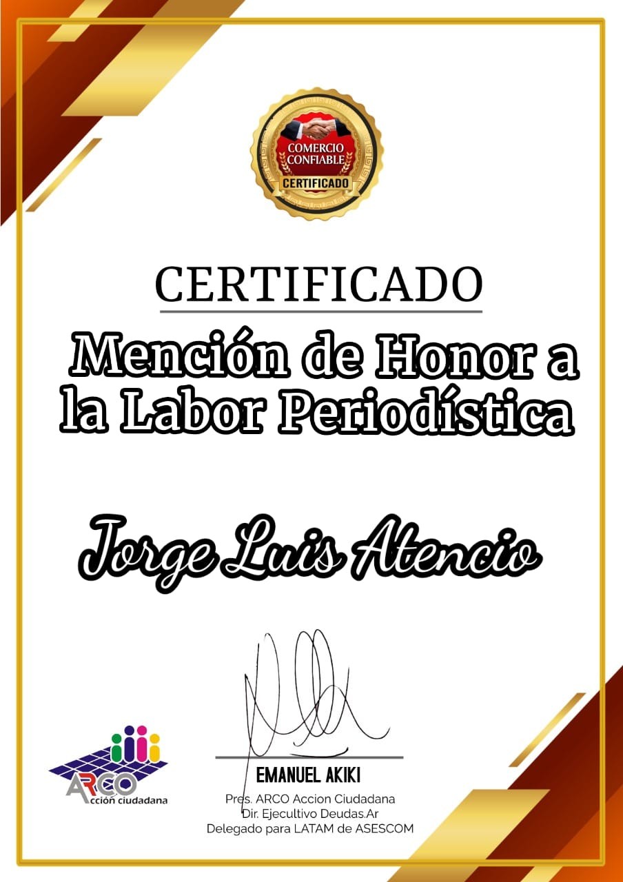 La entidad que tiene como finalidad cuidar el bolsillo del ciudadano a cargo de Emanuel Akiki,entrego un reconocimiento a Jorge Luis Atencio Montivero,editor y propietario de minibubuteinforma.com.ar por sus 30 años de labor ininterrumpida en los medios de prensa local.