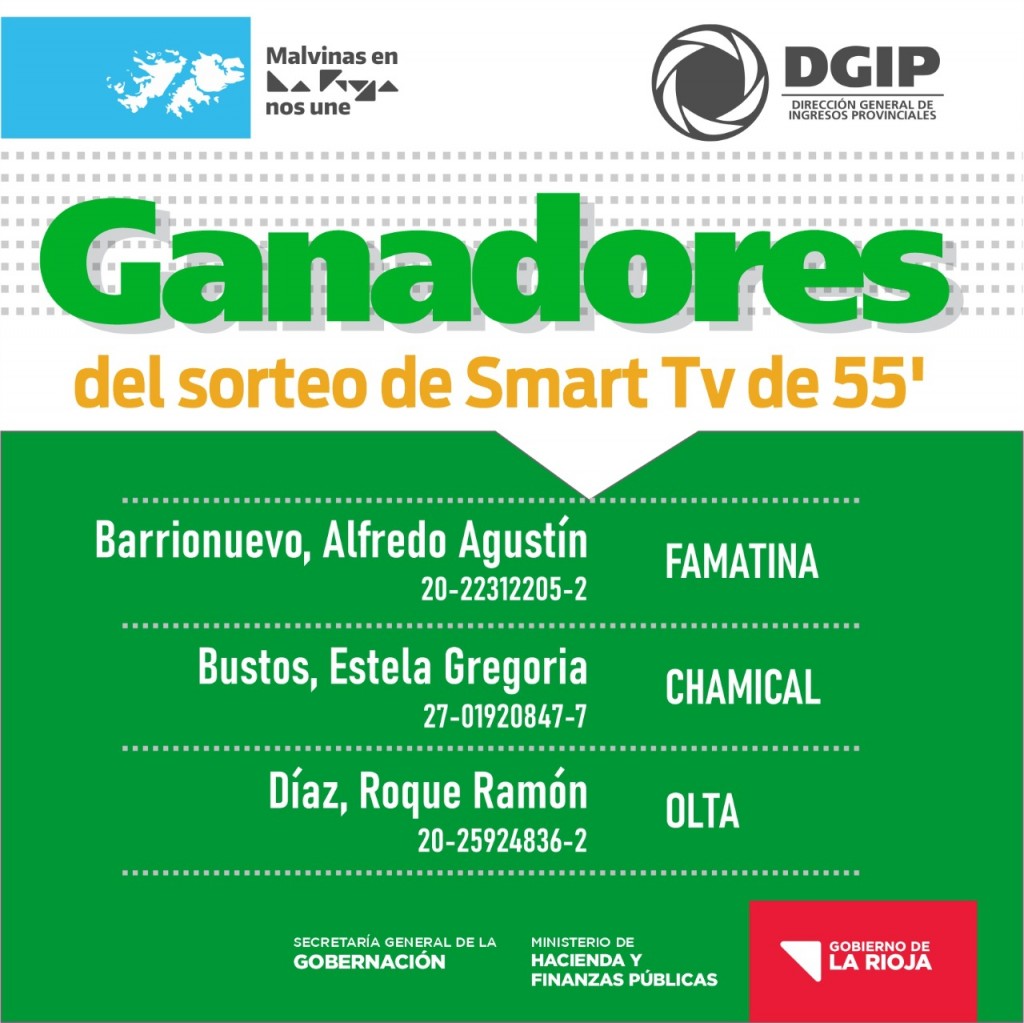 Barrionuevo Alfredo, cuit 20-22312205-2 de Famatina, Bustos Estela Gregoria, cuit 27-01920845-7 de Chamical, y Diaz Roque Ramón, cuit 20-25924836-2 de Olta fueron los ganadores de este sorteo que se llevó a cabo gracias a la Secretaría de la Gobernación que en conjunto con la Dirección General de Ingresos Provinciales ejecutaron la iniciativa para fomentar la responsabilidad tributaria y reconocer a aquellos y aquellas contribuyentes que con su aporte benefician al desarrollo local.