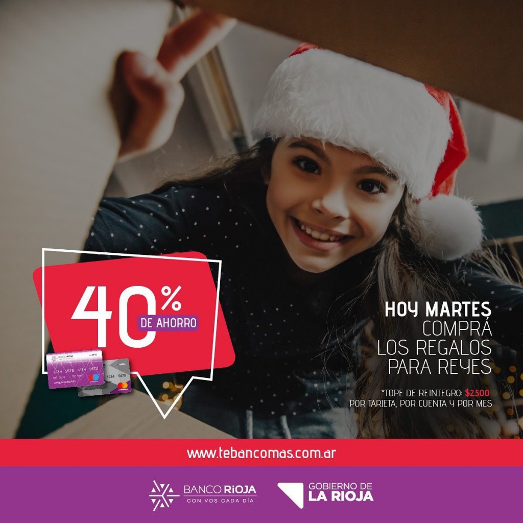 Con la promoción bancaria Te Banco MÁS – que impulsa Banco Rioja en conjunto con el Gobierno provincial- las familias riojanas podrán acceder hoy a beneficios exclusivos para las compras de los regalos de Reyes Magos en comercios adheridos de diversos rubros de toda la Provincia pagando con tarjeta de débito y crédito emitida por la entidad.