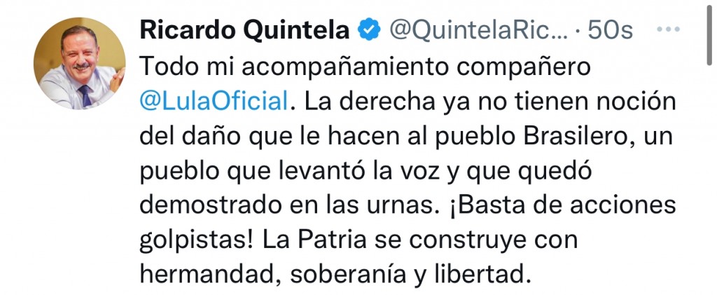 Intento de Golpe de Estado en Brasil: Quintela brindo su apoyo a Lula Da Silva