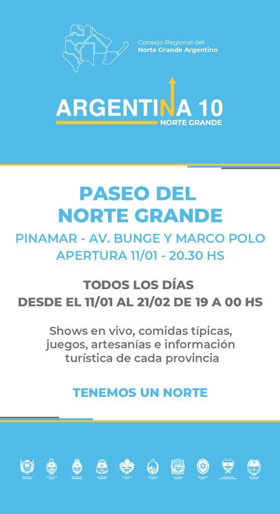 En la segunda edición del “Paseo del Norte Grande” en la Costa Argentina, las 10 provincias del norte argentino: Catamarca, Chaco, Corrientes, Formosa, Jujuy, La Rioja, Misiones, Salta, Santiago del Estero y Tucumán, promocionarán su cultura, turismo y gastronomía tradicional, desde el 11 de enero al 21 de febrero, en Pinamar. La Rioja, en particular, presentará sus atractivos del 12 al 15 de enero.