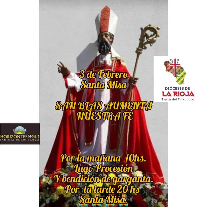 La misa esta a cargo de nuestro obispo Dante Braida, sacerdote padre Miguel Pollano,Roberto Rearte Miguel Maidana, otros sacerdotes y diácono.Acompañada por autoridades provinciales y departamentales.Estará presente tambien el coro San Blas.Lugo la tradicional proseción y bendición de garganta en (forma general por medidas sanitarias ).Tambien el homenaje de nuestro atletas y la agupacion gaucha,a nuestro patrono.Por la tarde se celebrara misa a las 20hs.