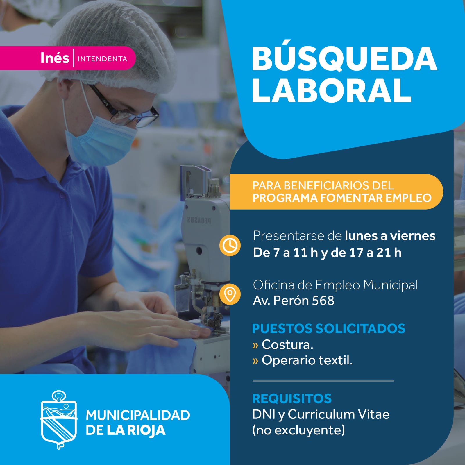 La Municipalidad de La Rioja informa los puestos laborales a cubrir para beneficiarios y beneficiarias del programa que es articulado junto al Ministerio de Trabajo, Empleo y Seguridad Social de Nación.