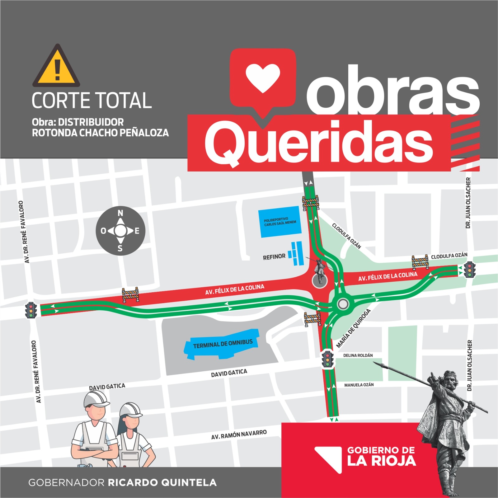 El Gobierno de La Rioja comunica que este jueves 23 de febrero comenzará el corte de tránsito total en la zona de la rotonda del Chacho, por las obras de remodelación de ese punto neurálgico de la ciudad. Por lo tanto, quienes deban circular por esa zona deberán hacerlo por las vías alternas que estarán debidamente señalizadas.