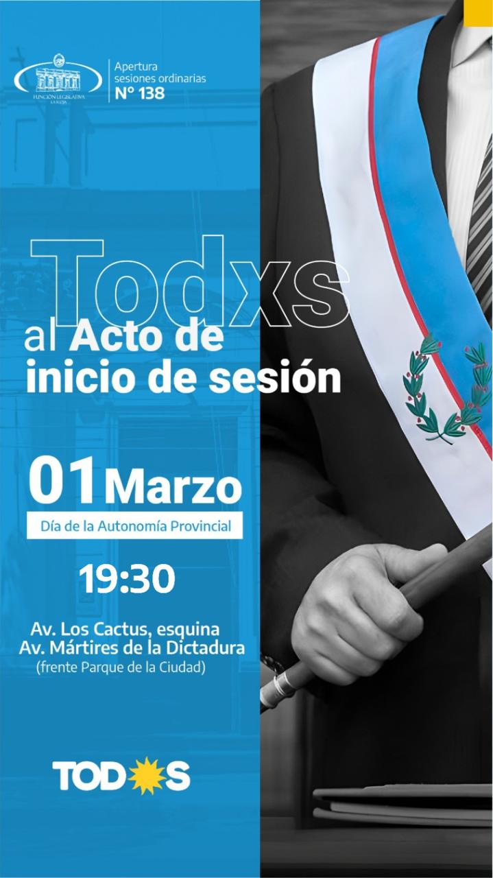 Posteriormente, la jornada legislativa continuará a partir de las 19.30 horas con el acto de apertura del 138° Período de Sesiones Ordinarias frente al Parque de la Ciudad (Av. Los Cactus esq. Av. Mártires de la Dictadura), donde el Gobernador Ricardo Quintela, dará lectura al discurso anual, previsto en el artículo 126 de la Constitución de la Provincia La Rioja.