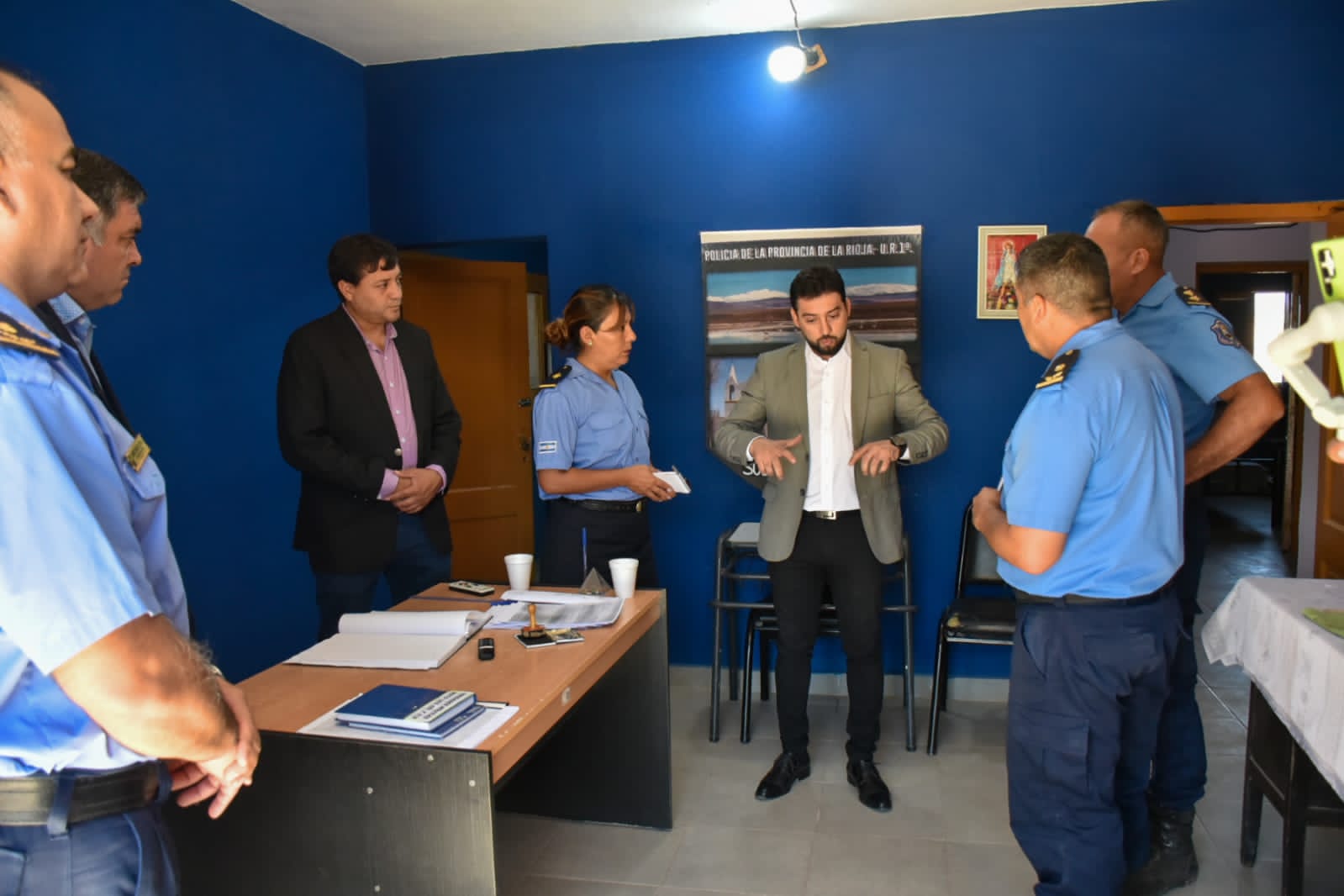 En la oportunidad, el ministro, que estuvo acompañado por el intendente departamental, Gustavo Arias, el diputado provincial, Alejandro Verasay, el segundo jefe regional a cargo, Julio Cesar Rodríguez, el jefe de la comisaría de Vinchina, comisario inspector, Walter Loyola y la Jefa de la Subcomisaria de Jague, subcomisario, Gladis Barrera Gaitán, se reunió con el personal policial para tomar conocimiento de la situación en materia de seguridad del departamento, las necesidades y requerimientos para mejorar el funcionamiento de las tareas de prevención y control en dicha jurisdicción.