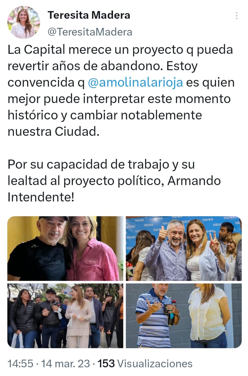 En su cuenta de Twitter,Madera expreso "La Capital merece un proyecto q pueda revertir años de abandono. Estoy convencida que es quien mejor puede interpretar este momento histórico y cambiar notablemente nuestra Ciudad. Por su capacidad de trabajo y su lealtad al proyecto político, Armando Intendente!
