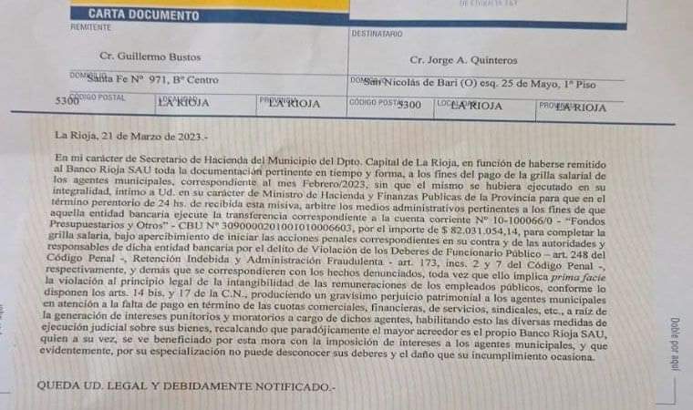 El gobierno provincial asegura que el pago al empleado municipal no corre peligro cómo plantea la Intendenta Inés Brizuela y Doria, quien volvió a mandar esta carta documento reclamando los 82 millones que el gobierno aportó para afrontar el pago de los más de 600 funcionarios municipales.