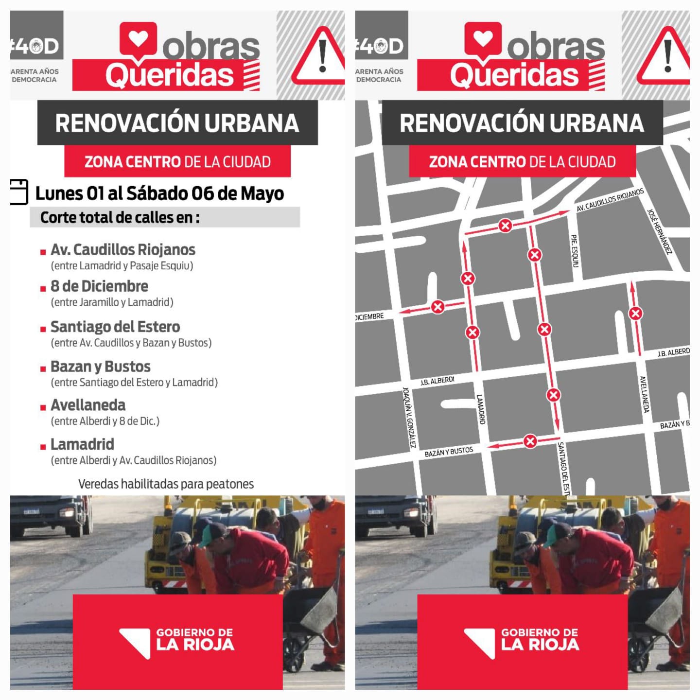 El Gobierno de la Provincia informa que durante el mes de mayo continuarán los trabajos dentro del Plan de Renovación Urbana del Área Central y Desagües Pluviales, por este motivo algunas de las calles del sector norte del centro de la ciudad permanecerán cerradas al tránsito vehicular.