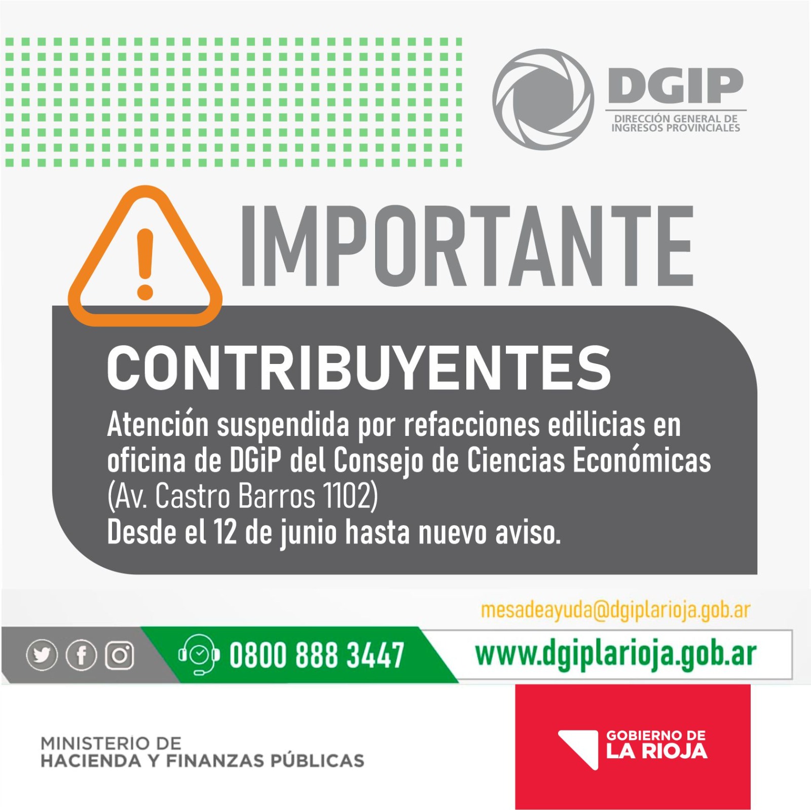 El Ministerio de Hacienda y Finanzas Públicas a través de la Dirección de Ingresos Provinciales informa que la oficina descentralizada, ubicada en el Consejo de Ciencias Económicas (Av. Castro Barros 1102) estará cerrada desde este lunes 12 de junio hasta nuevo aviso debido a refacciones que se realizarán en el edificio.